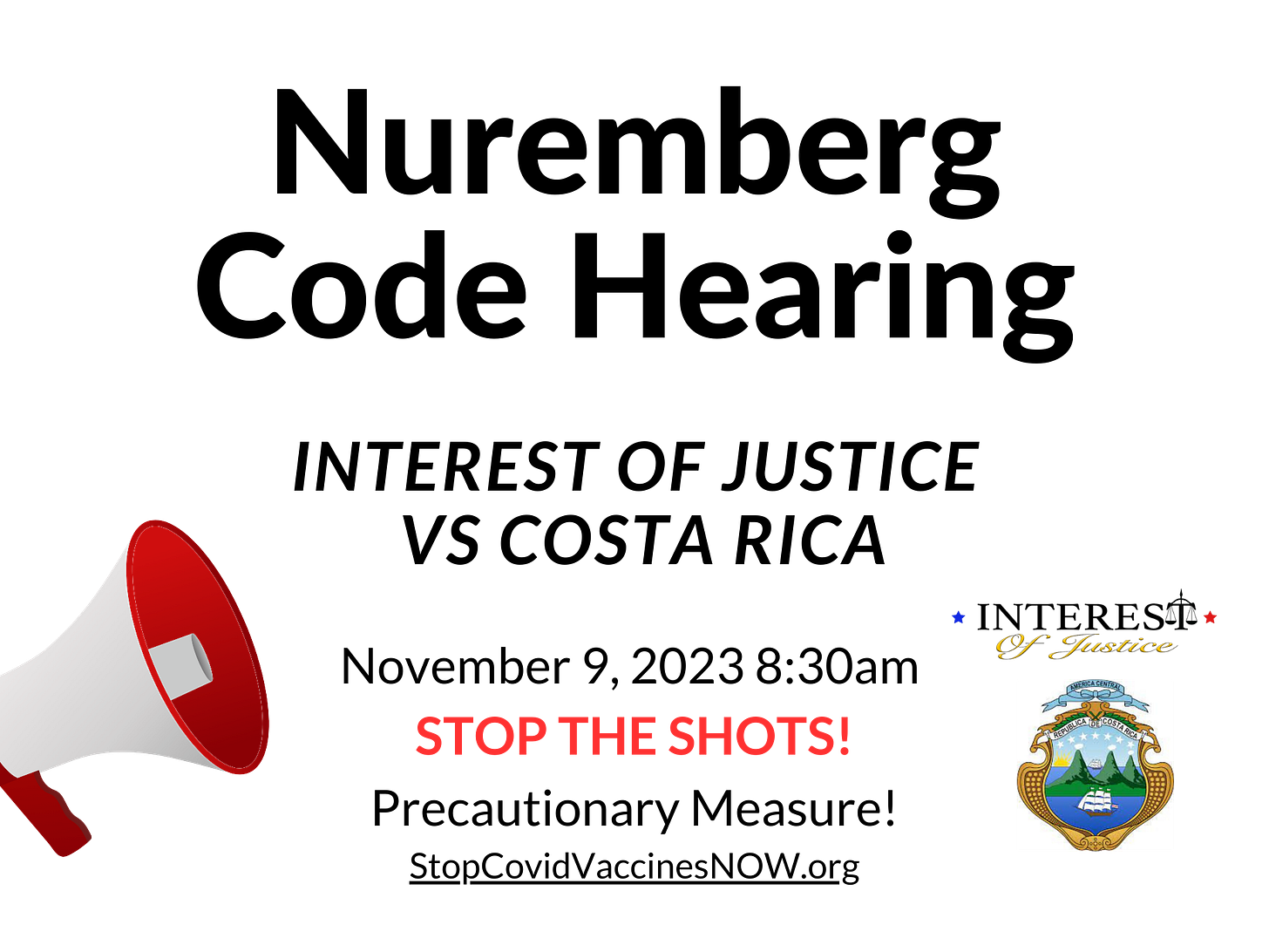 There is a court ORDERED Nuremberg Public Hearing November 9, 2023! Interest of Justice et al vs Costa Rica et al You are invited to watch live as we ask a judge with power to take the covid vaccines off the market in Costa Rica and globally to stop the shots - sign up at