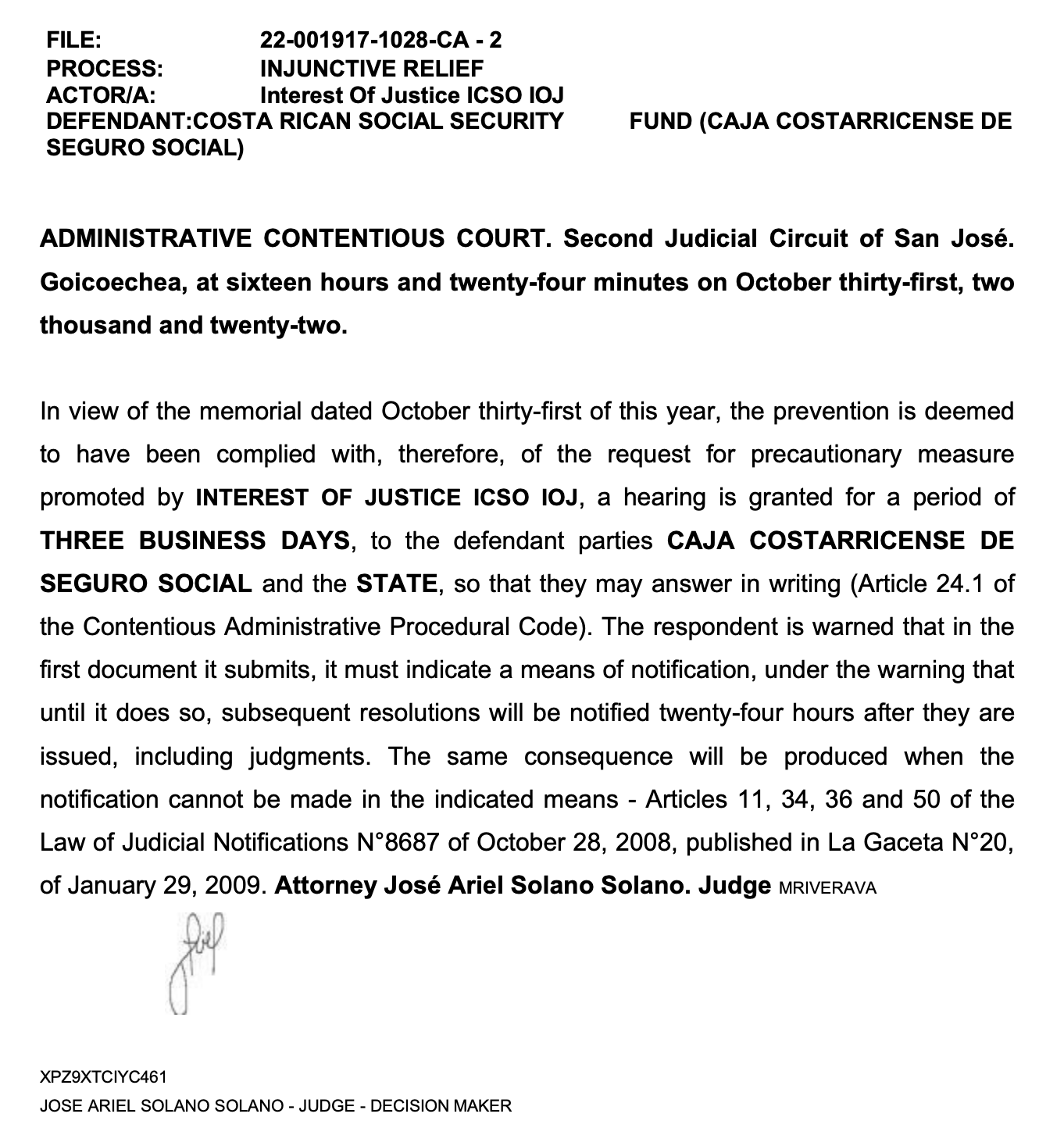 The State of Costa Rica Was Served With IOJ’S Bad Ass Injunction by The Administrative Contentious Court!