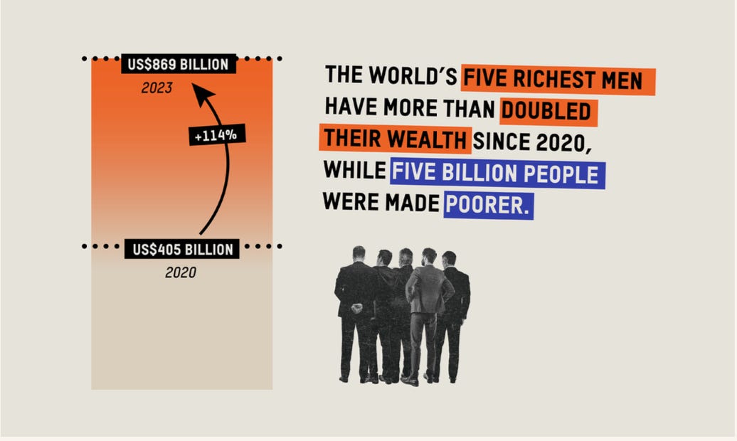 The combined fortunes of the world's five richest men have more than doubled to $869 billion since 2020 while five billion people have been made poorer, anti-poverty group Oxfam said.