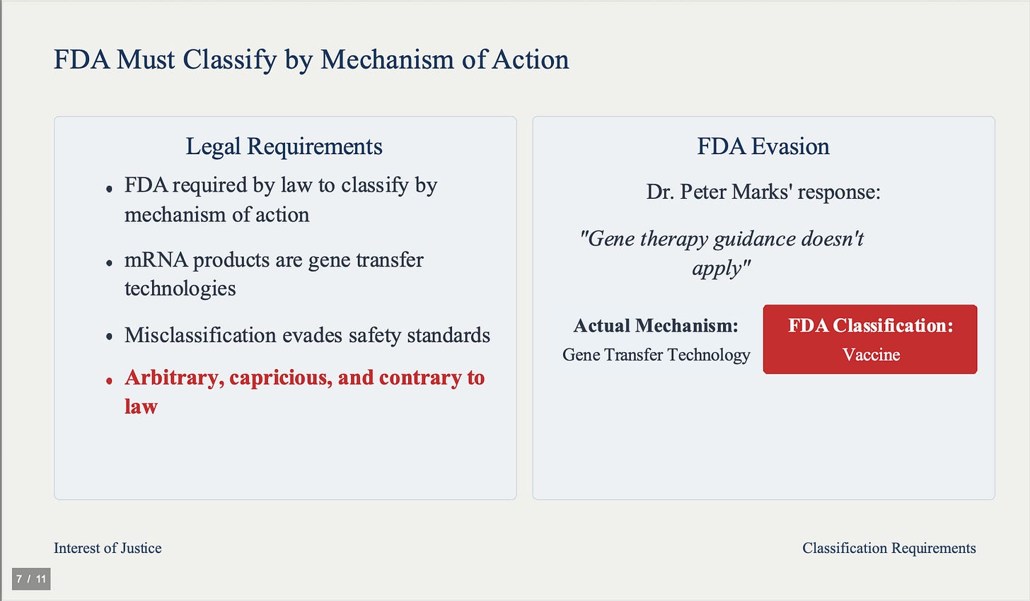 The FDA is required by law to classify products by their mechanism of action. These are gene transfer technologies, not vaccines. Dr. Peter Marks claimed that gene therapy guidance does not apply. This is arbitrary, capricious, and contrary to law. Misclassification evades required safety standards and exposes the public to unreasonable risk