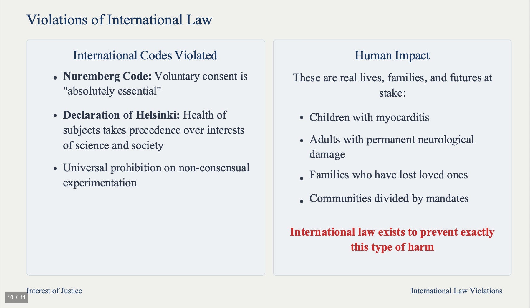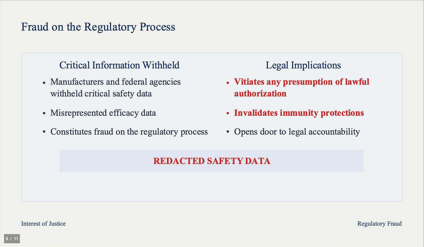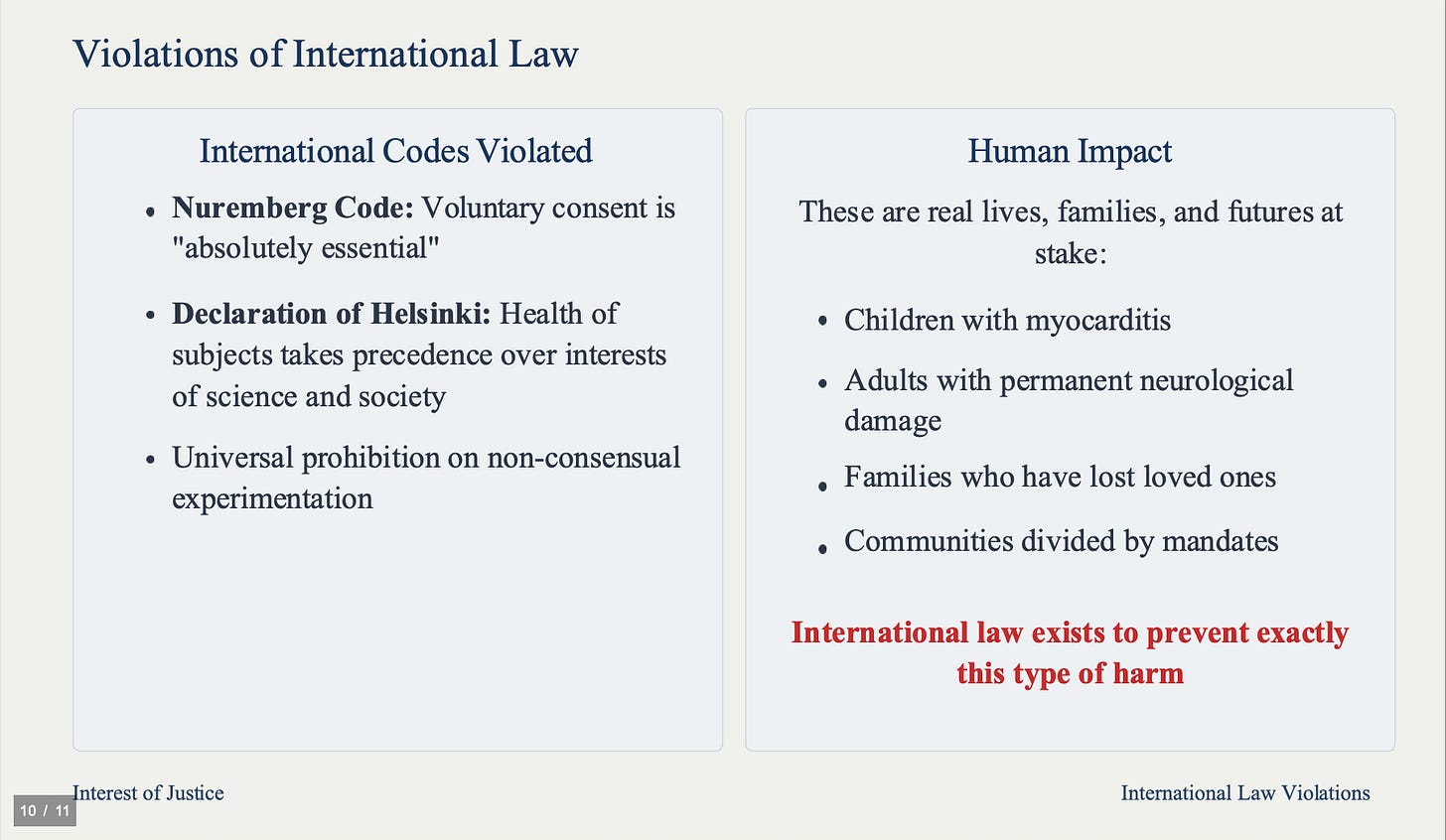 This conduct violates U.S. law and international norms, including the Nuremberg Code and Declaration of Helsinki, which prohibit non-consensual experimentation on human beings. These are real lives, families, and futures at stake.