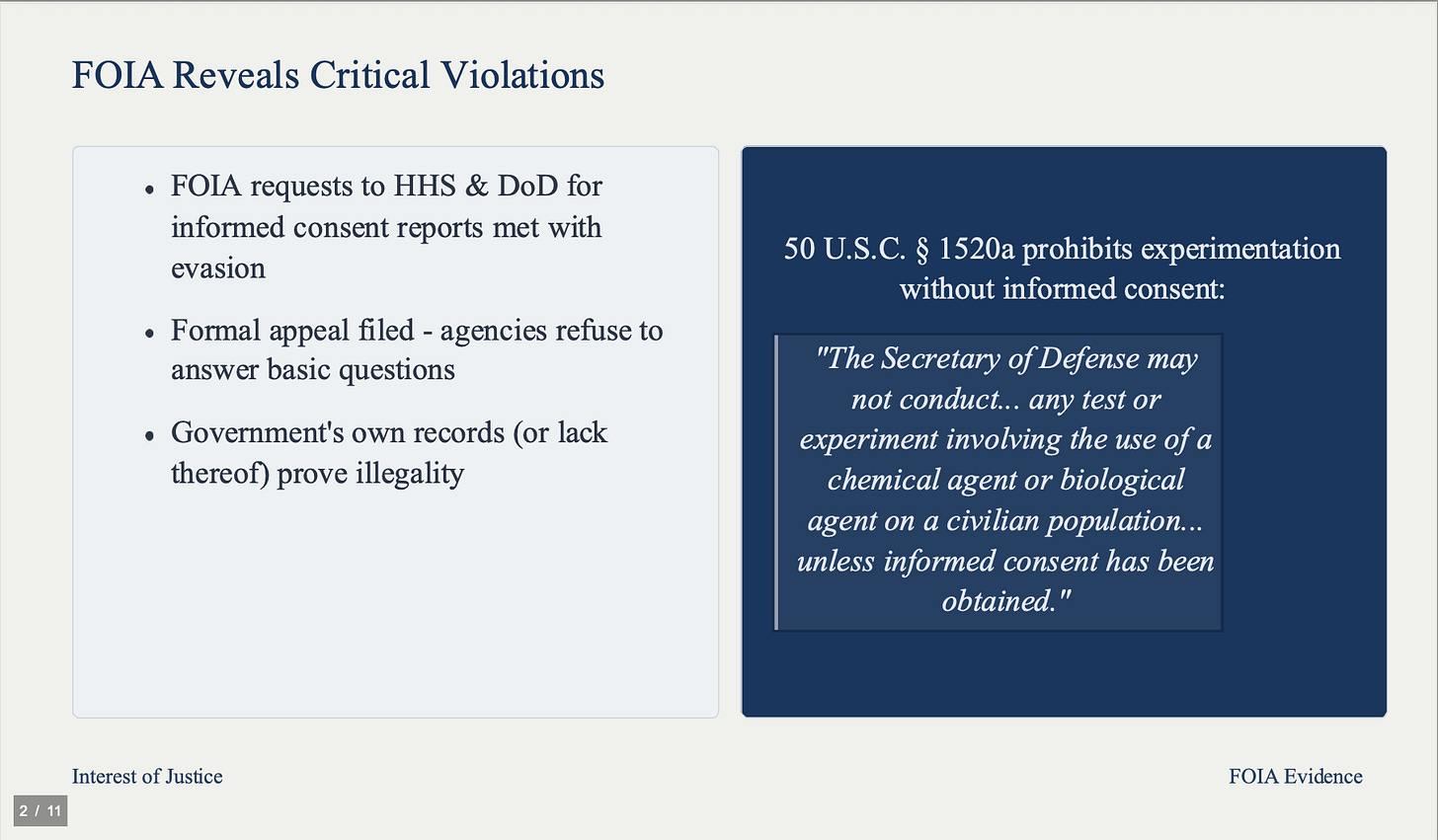 We have exercised our legal rights under FOIA to demand the statutorily required informed consent reports from HHS and the Department of Defense. Our requests have been met with evasion and delay. The agencies refuse to answer basic questions, including what authority they claim to override 50 U.S.C. § 1520a, which prohibits experimentation on the U.S. population without informed consent. The government's own records prove the illegality of this program.