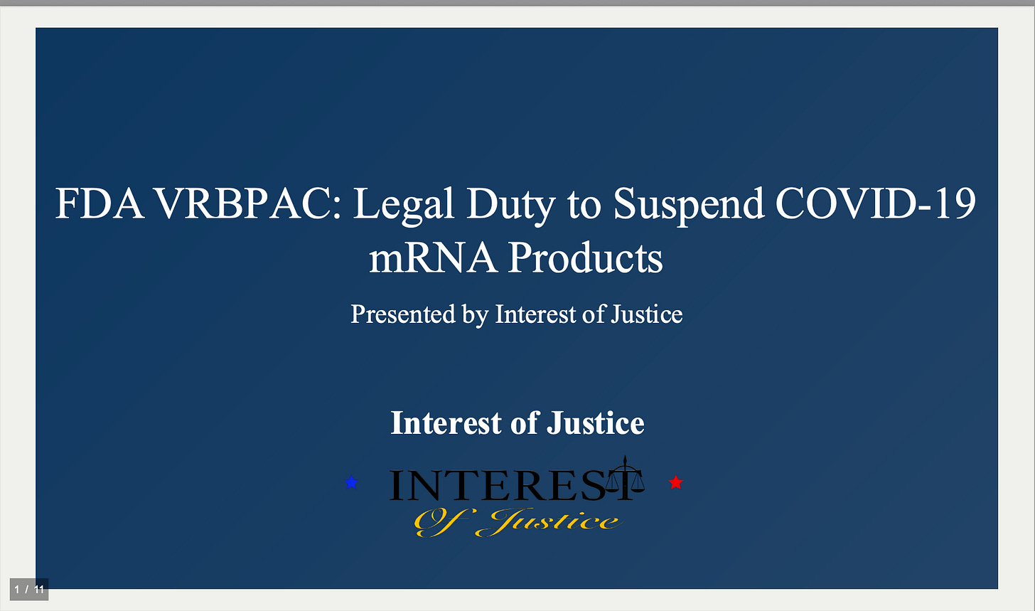 History: Our organization Interest of Justice spoke at the July 28, 2022 FDA VBRPAC meeting to protest the approval the covid-19 [non]vaccine bivalent versions.