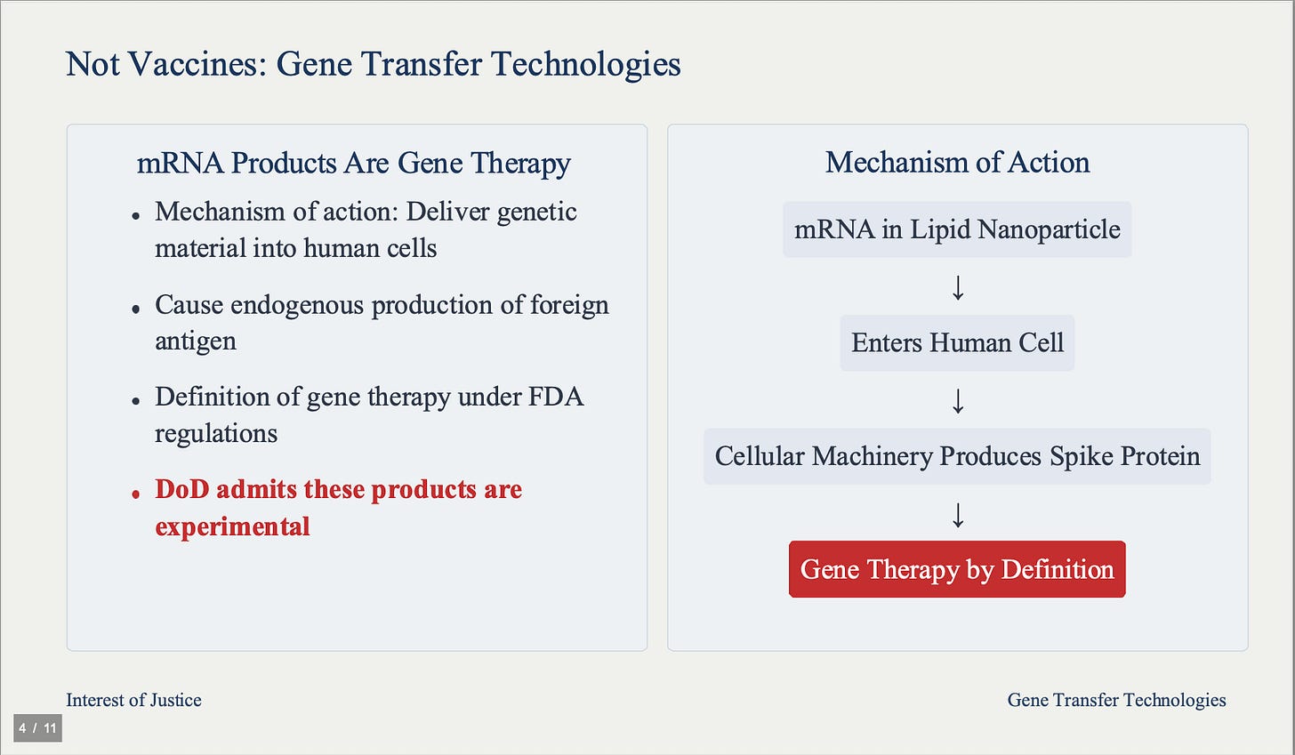 These products are not conventional vaccines, but gene transfer technologies. Their mechanism delivers genetic material into human cells, causing endogenous production of foreign antigens. This is the definition of gene therapy under FDA's own regulations which carries an unreasonable risk in healthy people according to FDA guidance. The Department of Defense has admitted these products are experimental.