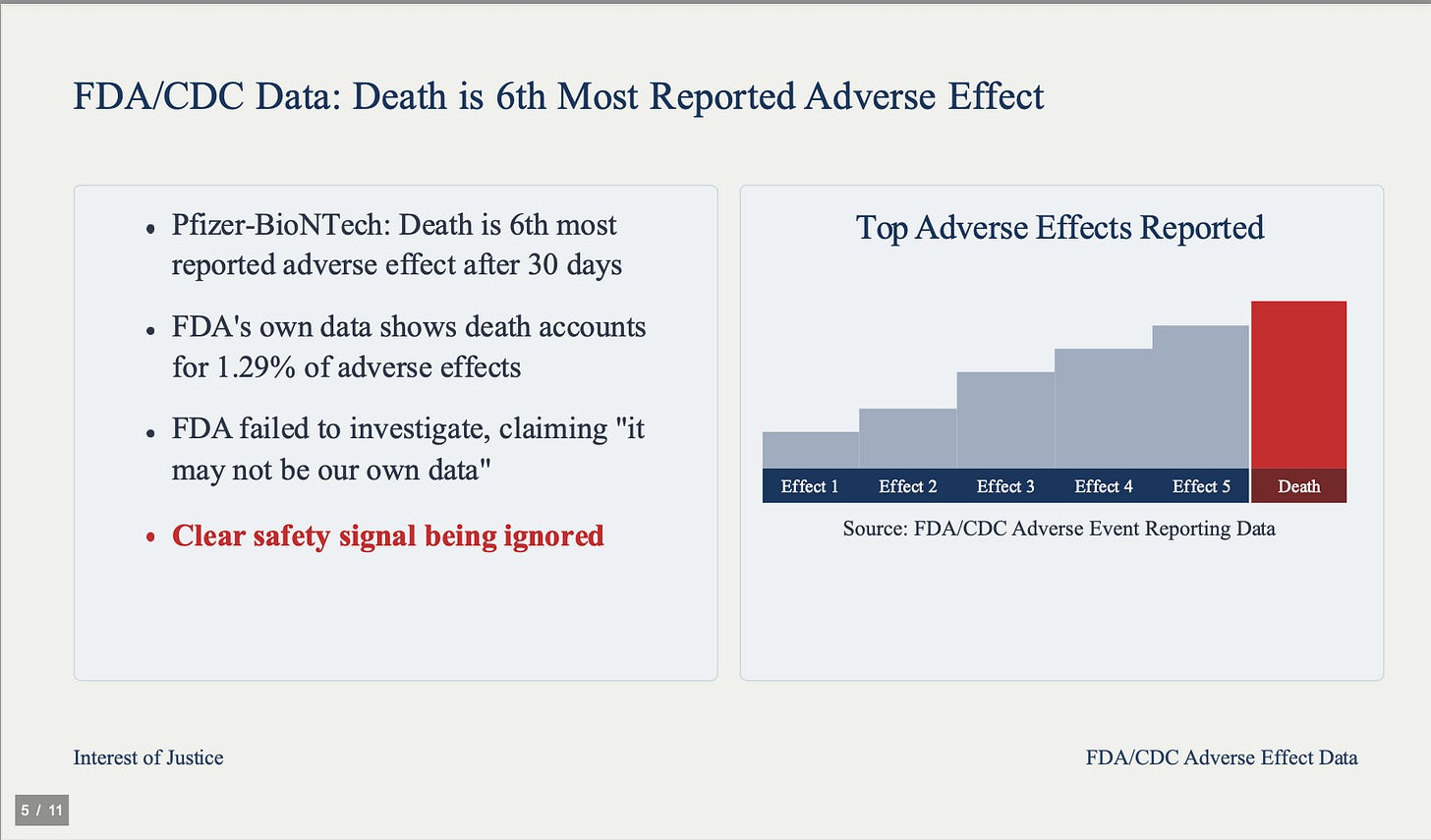 FDA and CDC data show that for Pfizer-BioNTech, death is the sixth most frequently reported adverse effect after 30 days. Death accounts for 1.29% of all reported adverse effects. The FDA has failed to investigate this clear safety signal, instead claiming "it may not be our own data." But it is your data, and it is your duty to act on it.