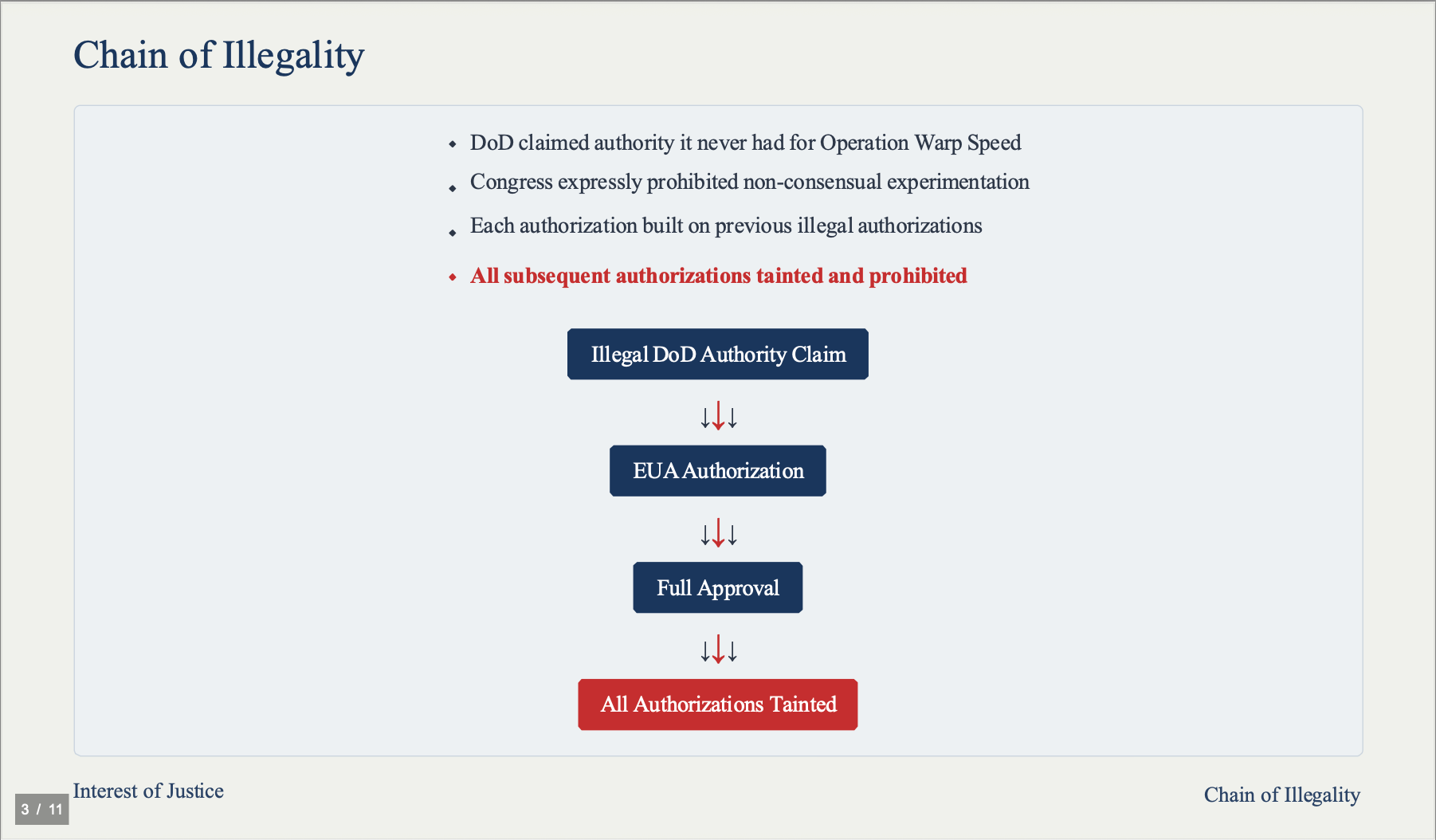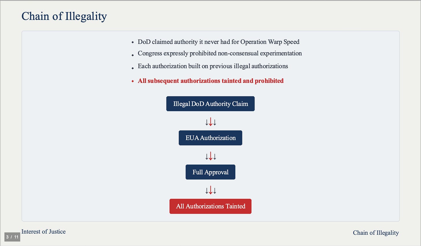This program began with fundamental fraud. The Department of Defense claimed authority it never had to initiate Operation Warp Speed. Congress expressly prohibited non-consensual experimentation on Americans. Because DoD never had lawful authority, every subsequent authorization was built on this original illegality. Each new authorization is tainted and prohibited, making all subsequent authorizations unlawful.