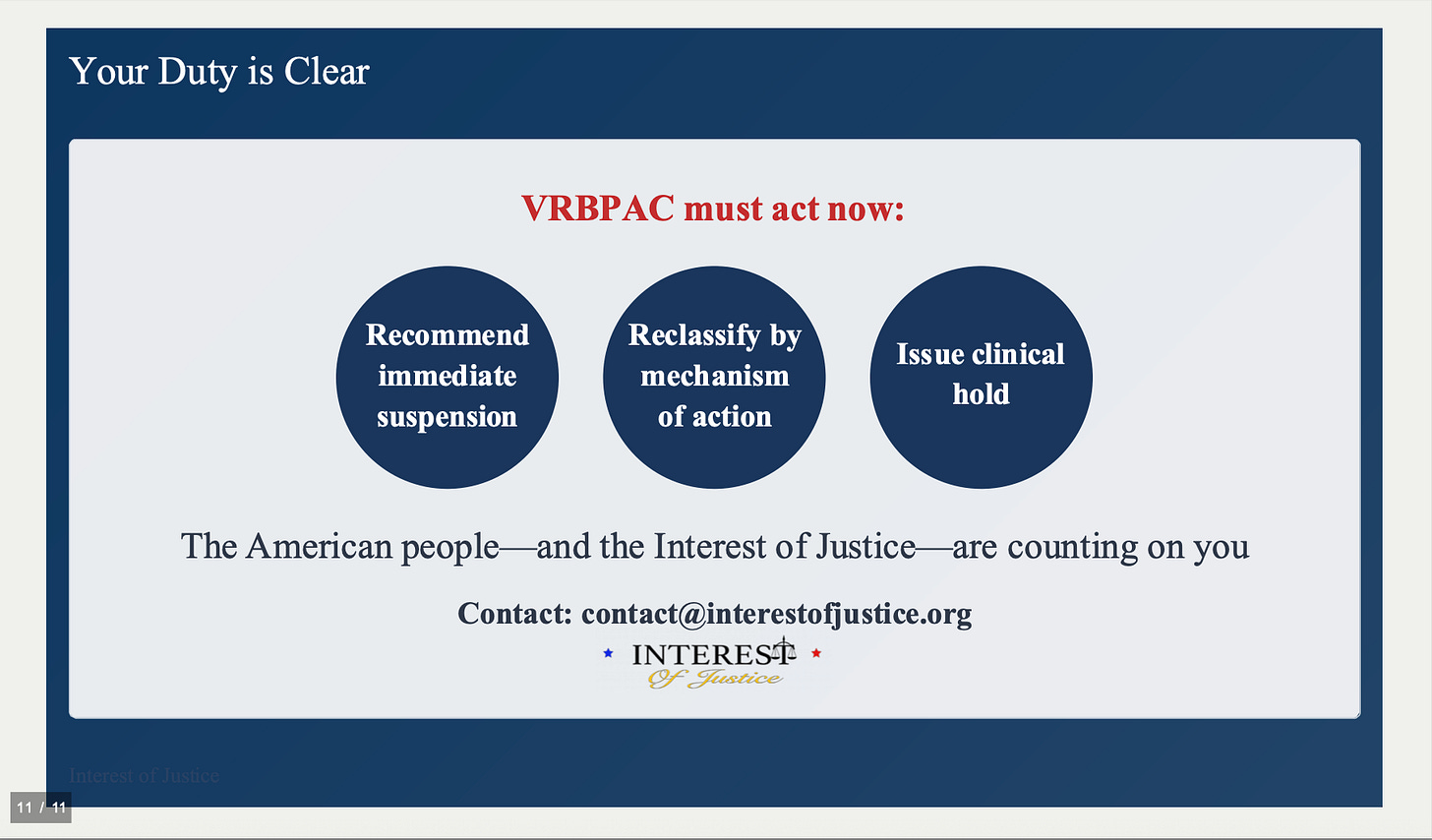 You are now fully informed. The law is clear. The science is clear. Your duty is clear: recommend immediate suspension, reclassification by mechanism of action, and issuance of clinical holds.