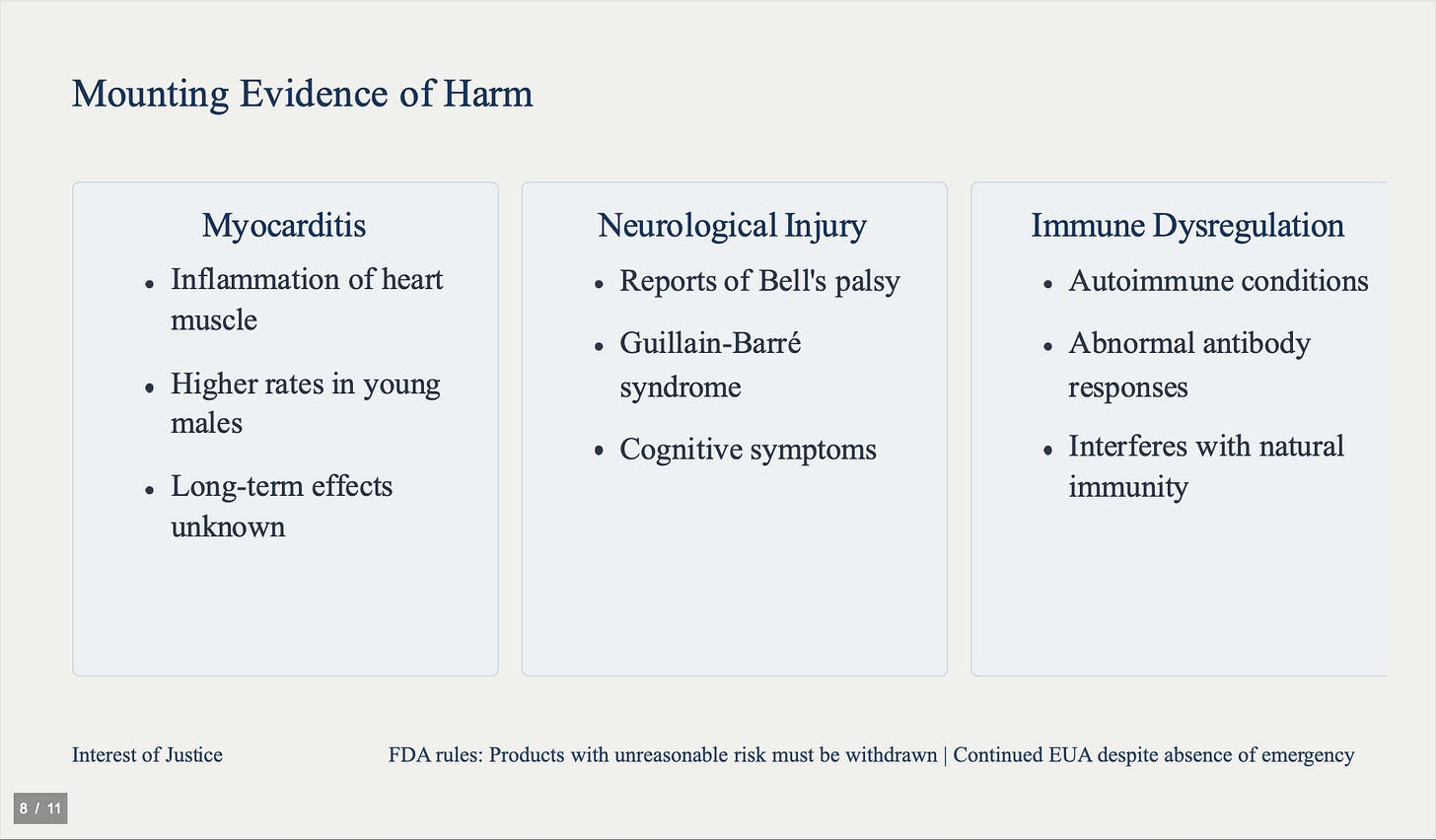 The evidence of harm is mounting: myocarditis, neurological injury, immune dysregulation. Under FDA's own rules, any product presenting unreasonable risk must be withdrawn from the market. Continued Emergency Use Authorization violates the Administrative Procedure Act and Food, Drug, and Cosmetic Act.