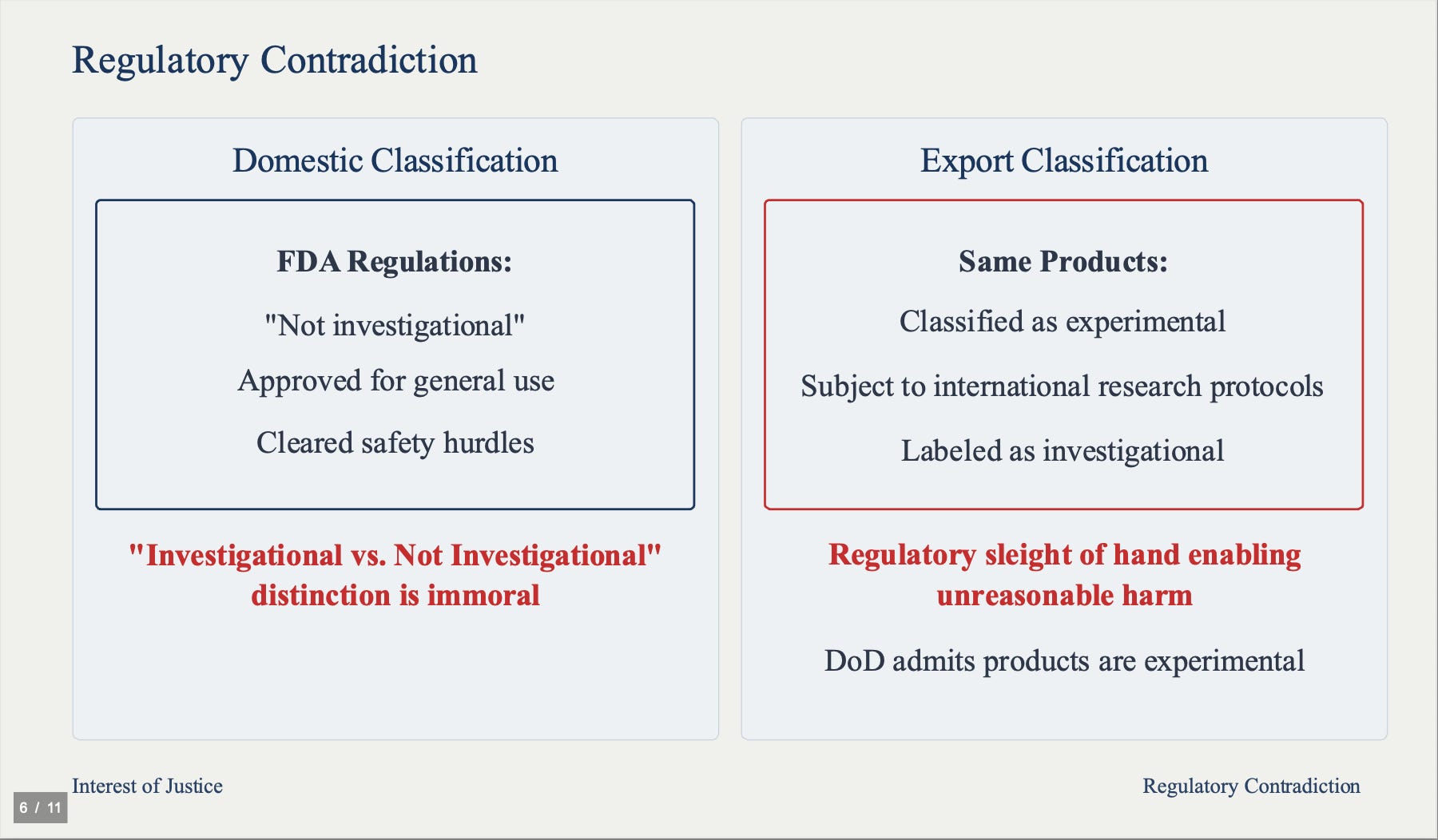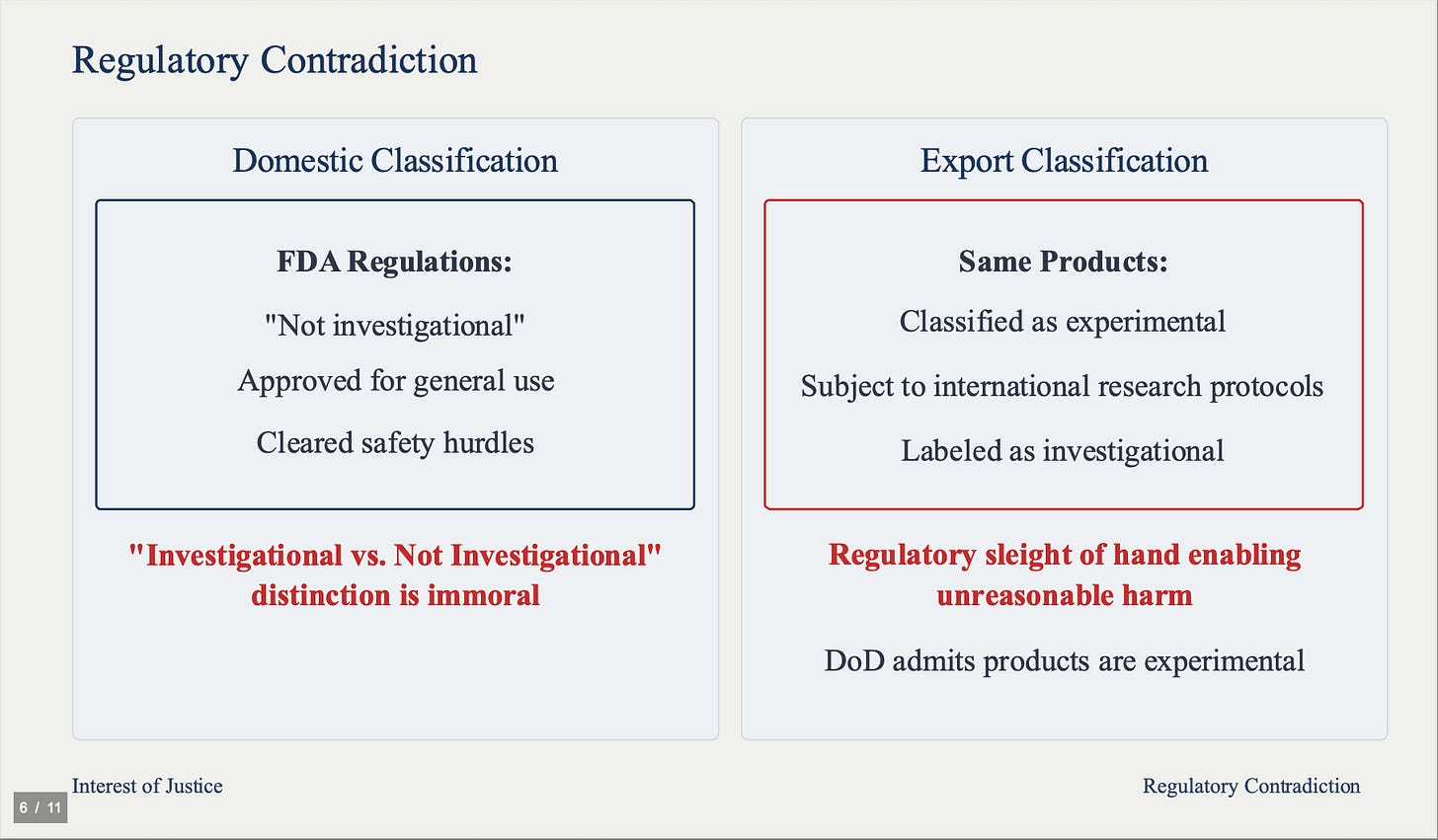 There is a glaring regulatory contradiction. The Department of Defense admits these products are experimental, yet FDA allows them to be treated as "not investigational" domestically while classifying them as experimental upon export. This regulatory sleight of hand enables ongoing use of products causing death at unreasonable rates.