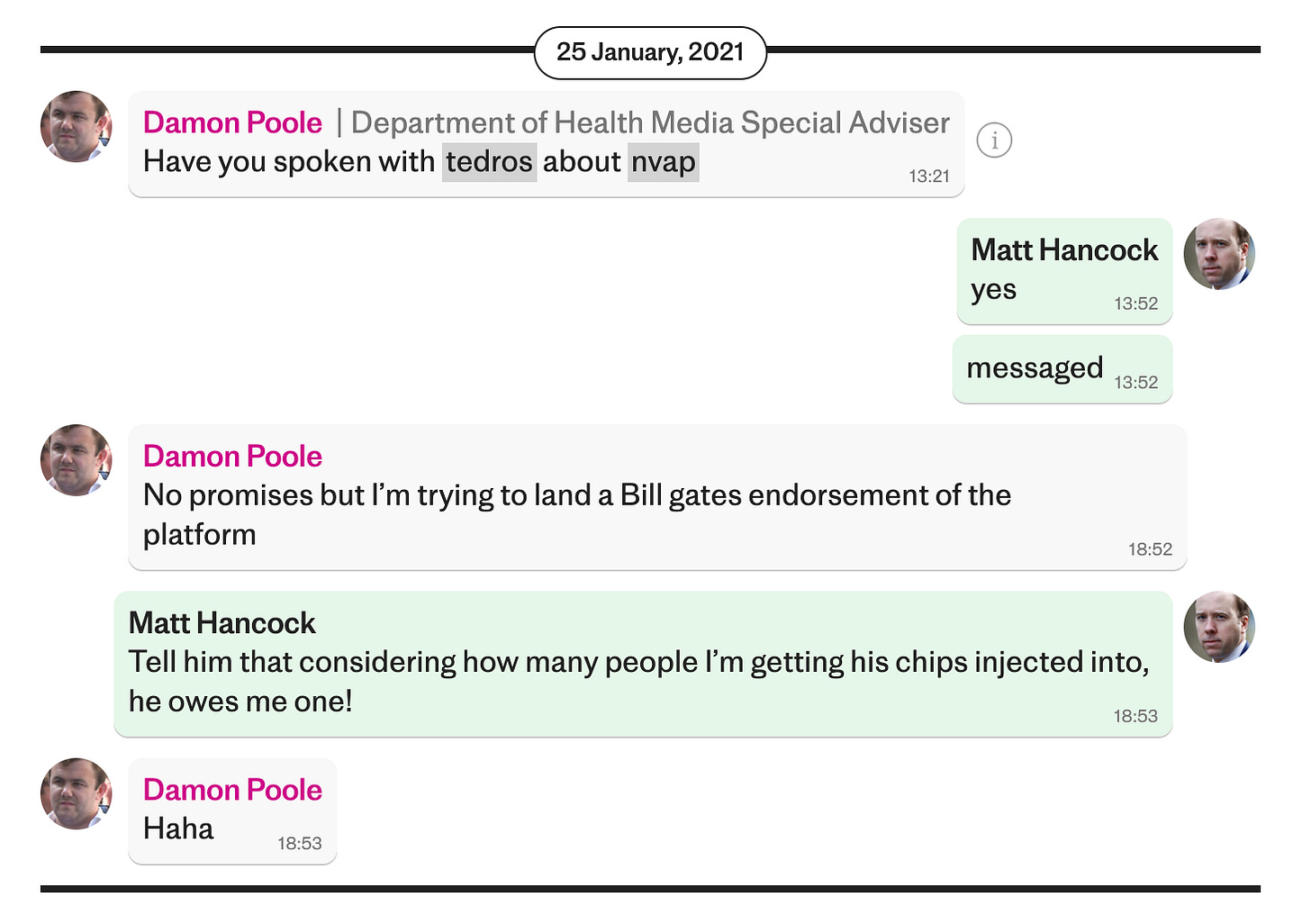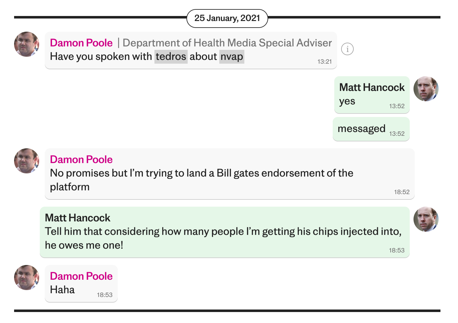 On Jan 25, 2021 Damon Poole, Mr Hancock’s media adviser, sent him a WhatsApp message asking him if he had spoken to Tedros Adhanom Ghebreyesus, the director general of the World Health Organisation, about the New Variant Assessment Platform (NVAP), which offered other countries UK expertise to detect and assess new variants around the world.
