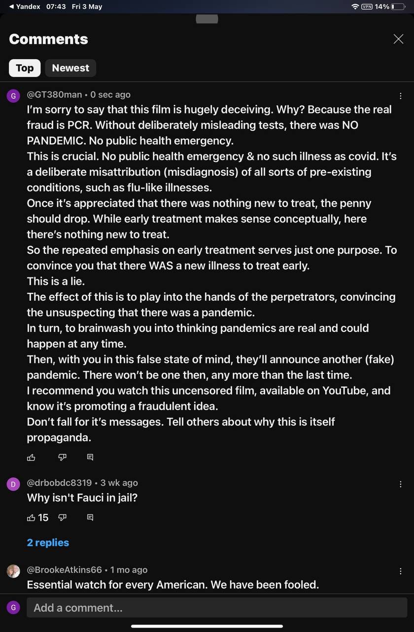 This is depressing. It’s apparently a truthful documentary, telling you about how the authorities conspired to prevent honest doctors using their expert judgement to prescribe “early treatments” that might save lives in people suffering from “covid”.