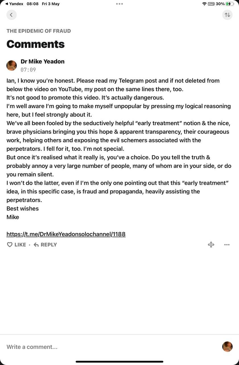 I’ve added a note on Dr Ian Brighthope’s Substack which contains the video. I think Ian is straight & put out the link to the video with good conscience.