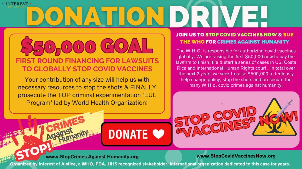 Make sure to stop by our websites to learn more about the Donation Drive we are launching so we can prosecute the crimes against humanity and afford the legal team to work full time until we stop the non vaccine globally off the WHO global emergency use listing (EUL)!