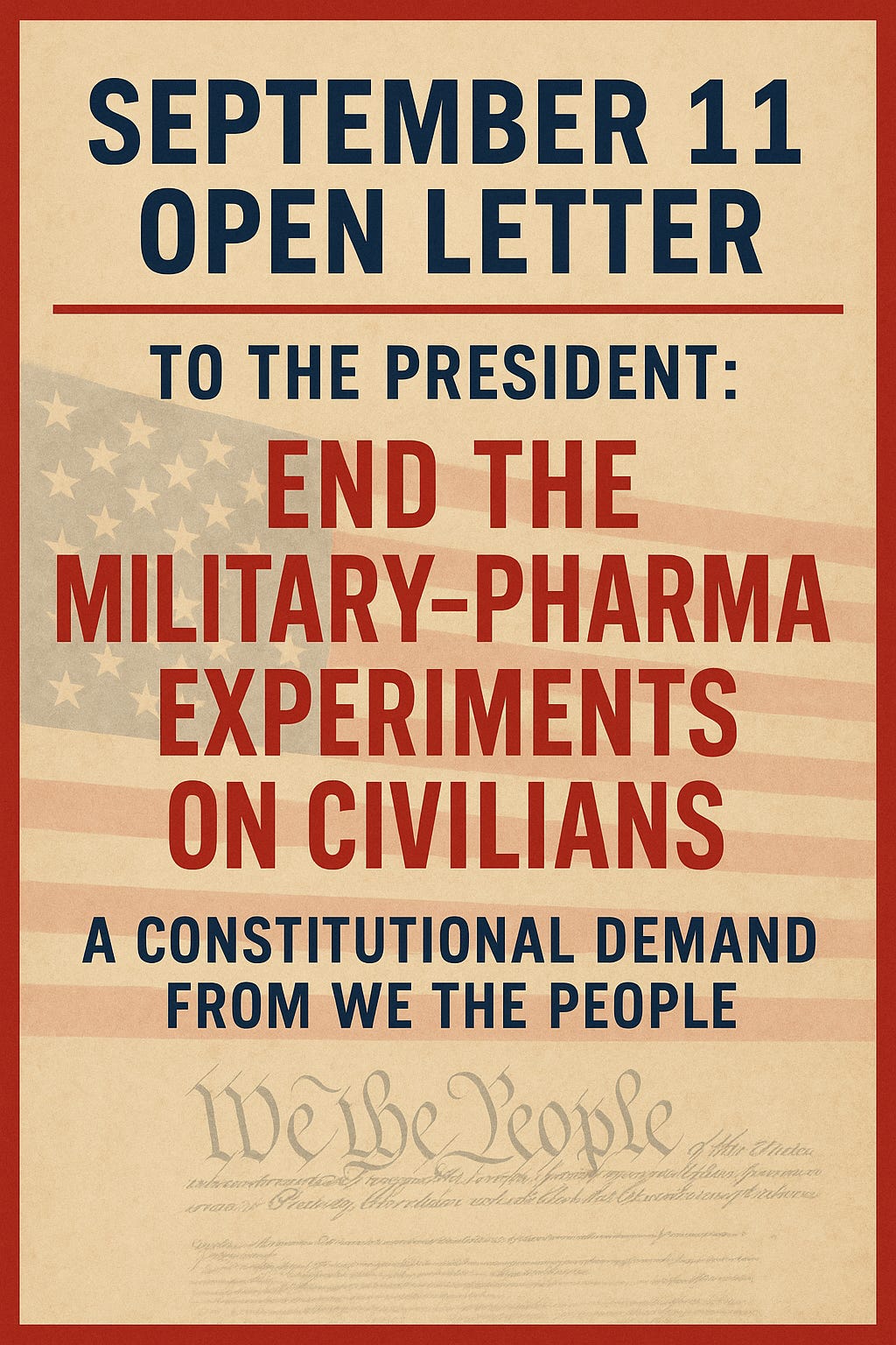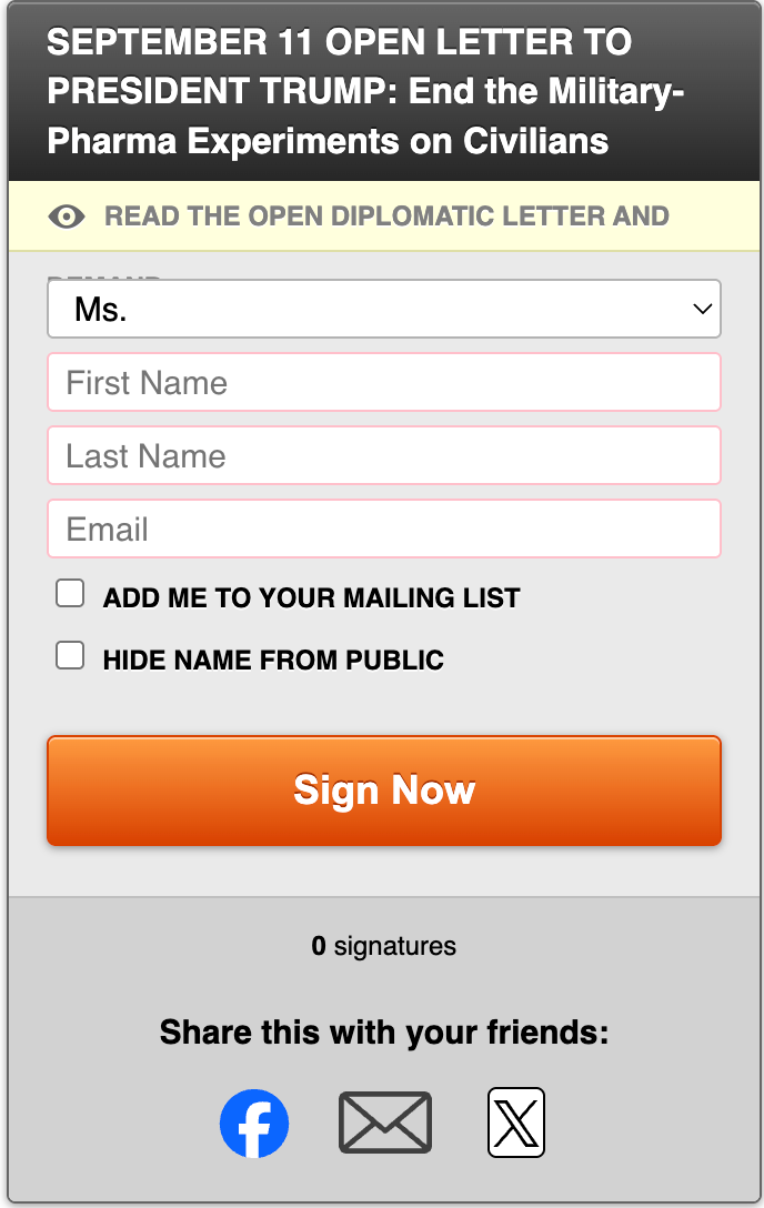 Excerpt: Mr. President, on September 11, 2001, America was attacked. On September 11, 2025, we demand you end the ongoing attack—the military-pharmaceutical experiments on American citizens conducted without informed consent