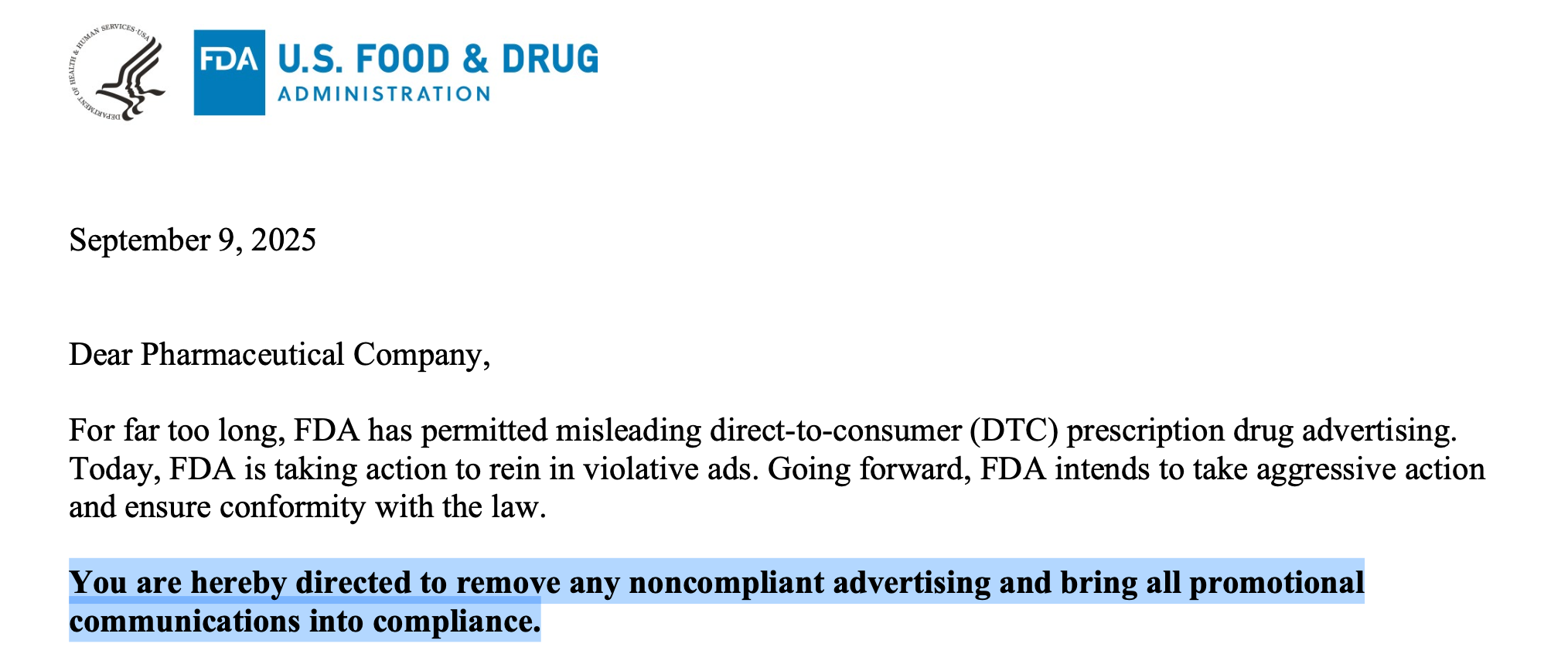 September 9: Presidential Memorandum initiated enforcement actions against pharmaceutical advertising