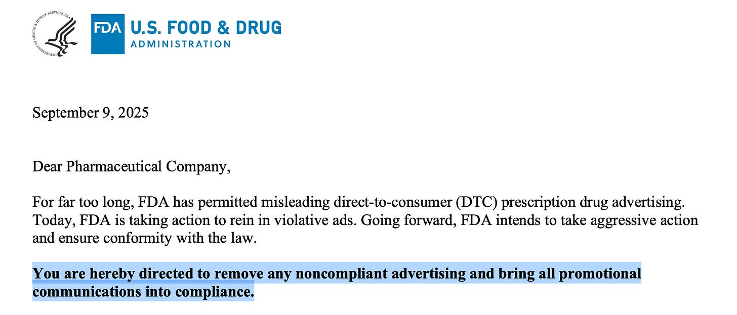 The administration's September 9th Presidential Memorandum cracking down on pharmaceutical advertising deception further confirms this trajectory. After years of the FDA sending only ONE warning letter in 2023 and ZERO in 2024, suddenly 100 cease-and-desist letters and thousands of warnings are being issued to drug companies.