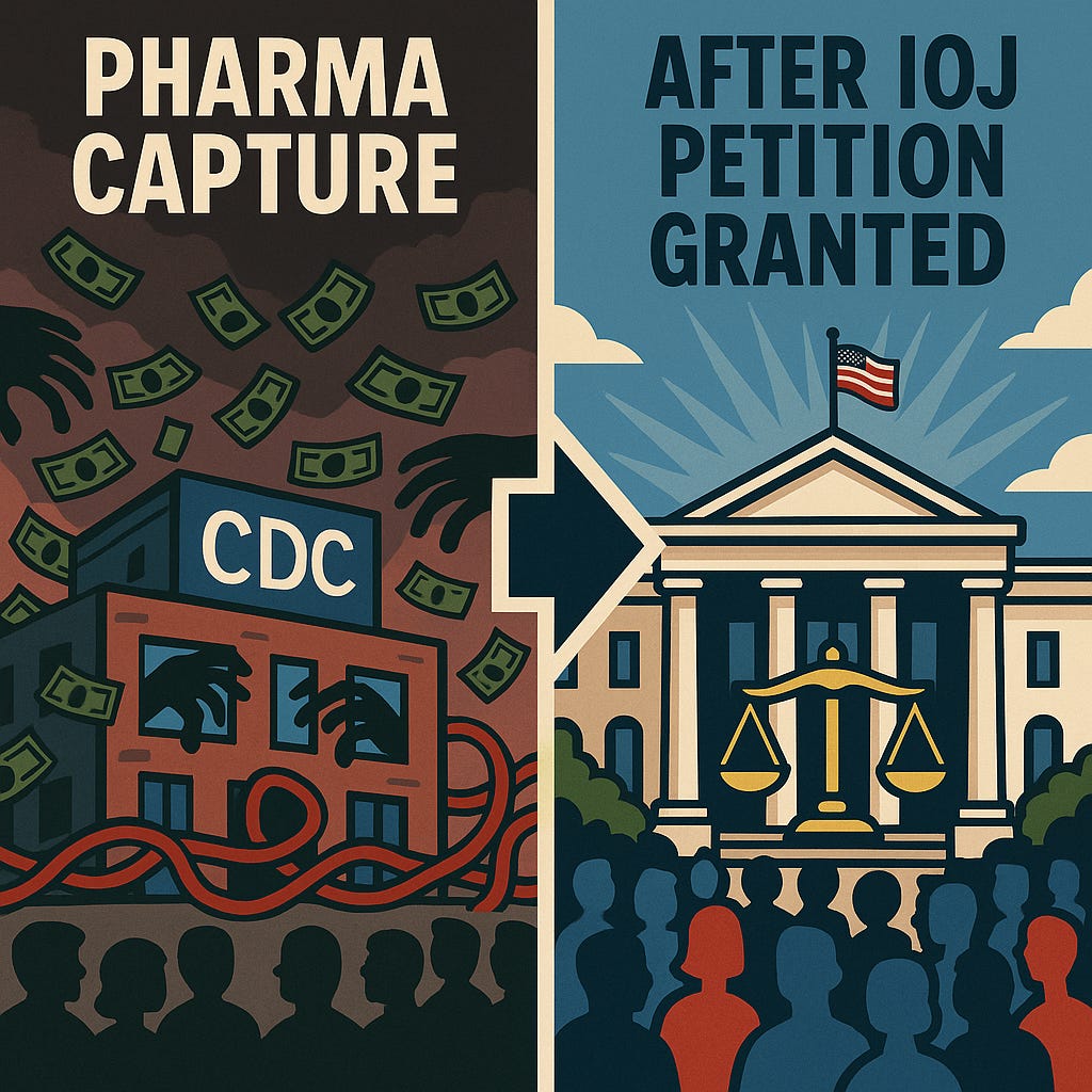 While we acknowledge RFK Jr.'s initial step in removing COVID vaccines for healthy people, this partial measure doesn't address the comprehensive violations documented in our June 20th petition currently on your desk. RFK Jr.'s own admission that pharmaceutical companies have created "corrupting entanglements" that have caused "a series of bad decisions" demands the complete remedy our petition provides - not incremental half-measures that leave the underlying constitutional violations unaddressed.