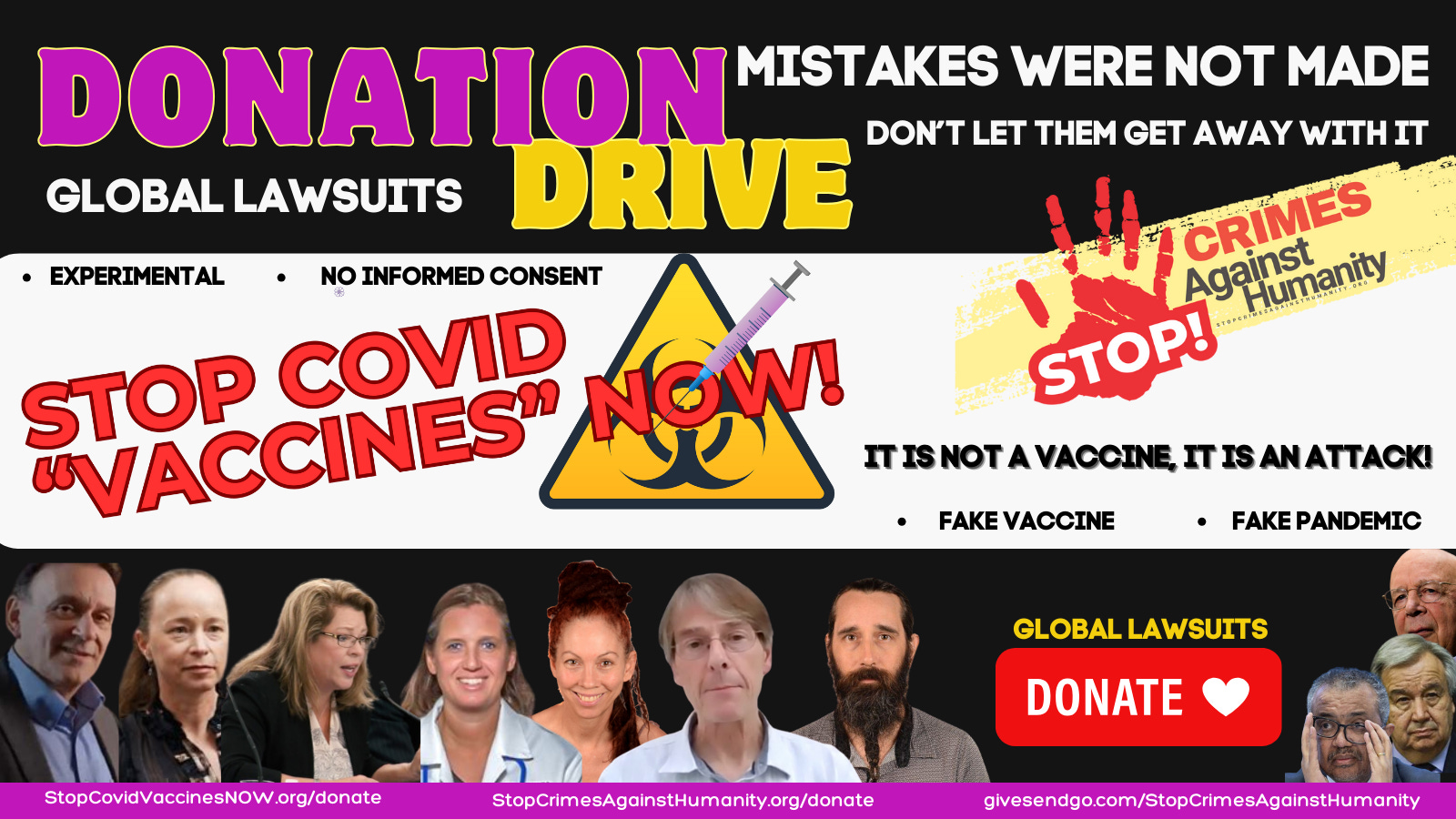 We did hire a lawfirm to help us, so donations are critical to our success to pay the Attorney’s monthly fees, especially to pay them what is needed to widen the case to indict more wrongdoers, all the way up to FDA, WHO DG Tedros & UN top officials involved.