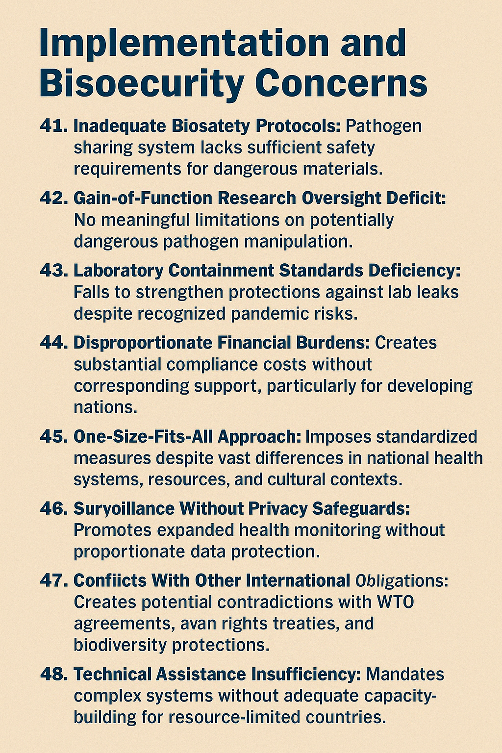 Laboratory Containment Standards Deficiency: Fails to strengthen protections against lab leaks despite recognized pandemic risks.