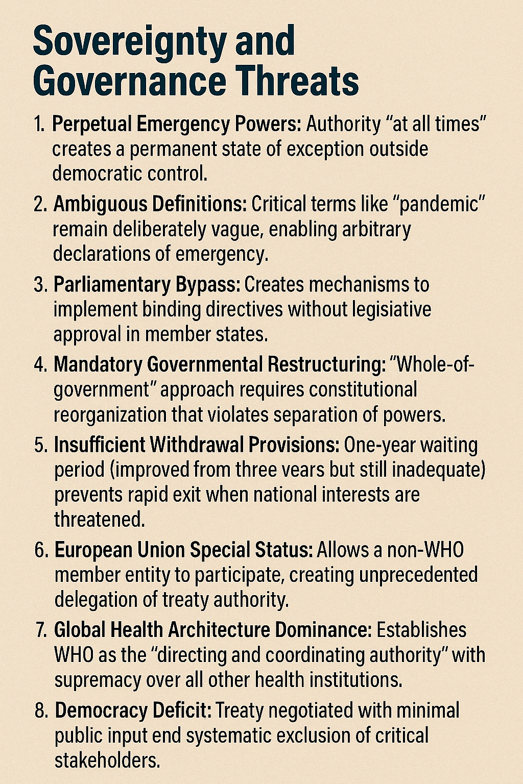 The ambiguous, open-ended derogation provisions and glaring omission of clear pathways for states to retract authority once granted create grave risks that signatories could become permanently ensnared in exceedingly burdensome obligations with no escape.[^8] Irrespective of drafter intent, the unavoidable reality is that this agreement launches a frontal assault on state sovereignty and democratic self-determination at a moment of unprecedented fragility in the post-war international order.[^9] No purported imperative of exigency can sanction such a reckless leap into a "post-democratic" global technocracy of experts.