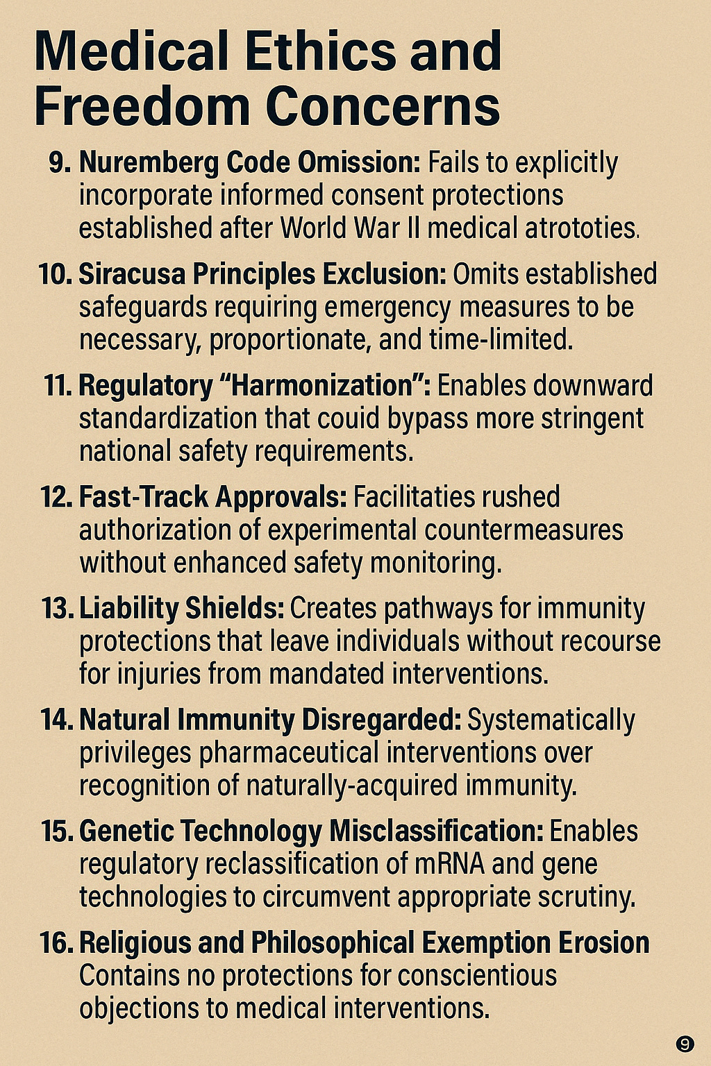 Articles 9-11 and 14 lumping all pandemic "countermeasures" together for "expedited" approval with no distinction between proven vs. experimental interventions effectively demolish bedrock informed consent requirements for unapproved drugs and vaccines.[^26] These were the single most critical medical ethics breakthrough of the 20th century following the Nuremberg Nazi atrocities, enshrined in the Helsinki Declaration and Belmont Report to stop human experimentation without voluntary assent.[^27] [^28]