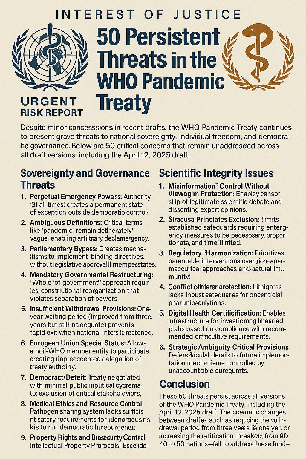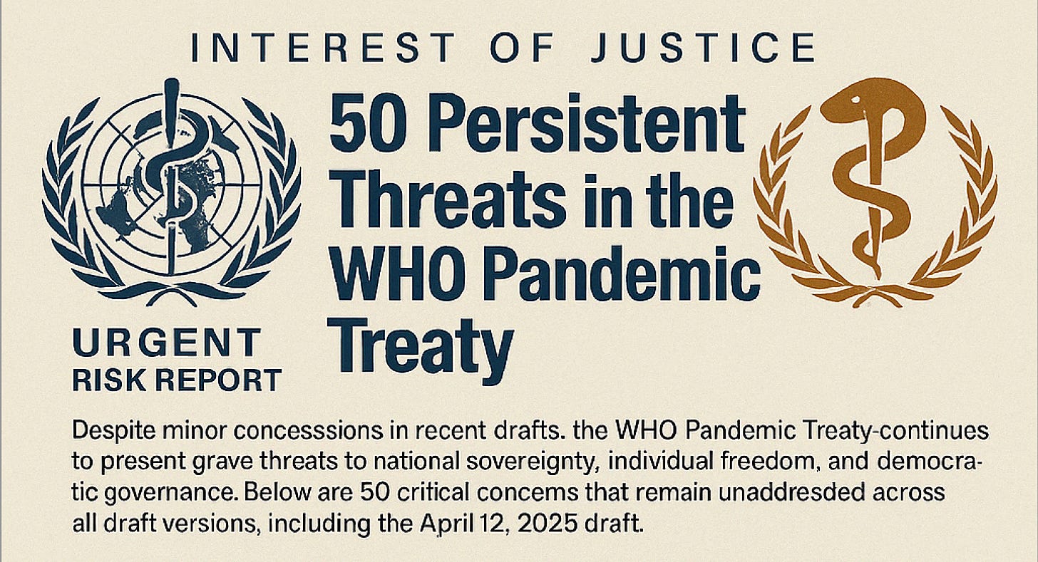 These 50 threats persist across all versions of the WHO Pandemic Treaty, including the newest April 12, 2025 draft. The cosmetic changes between drafts—that some insane CHAOS freedom fighters are celebrating as a “win”, such as reducing the withdrawal period from three years to one year or increasing the ratification threshold from 30-40 to 60 nations—fail to address these fundamental concerns.