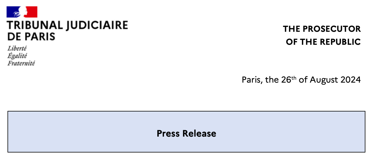 Official news was just released from the French prosecutor hell bent on taking down Telegram founder Pavel Durov (thus gaining a back door to spy):