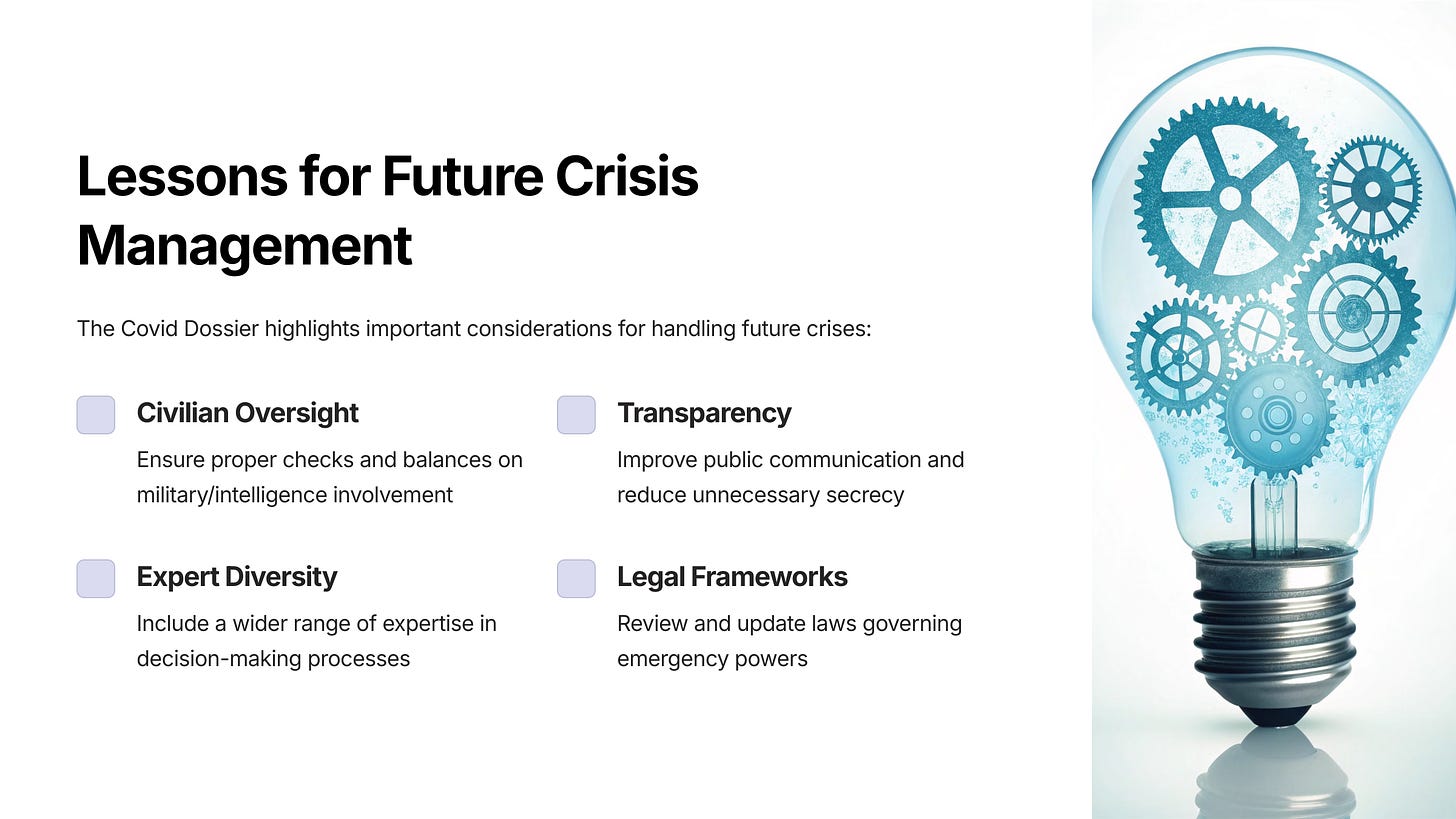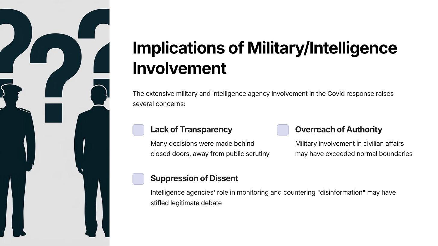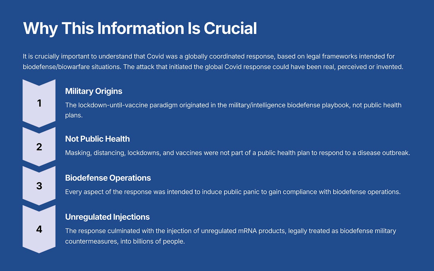 • The measures implemented, including lockdowns, masking, and the deployment of mRNA vaccines, were part of a military biodefense strategy rather than a scientifically based public health plan.