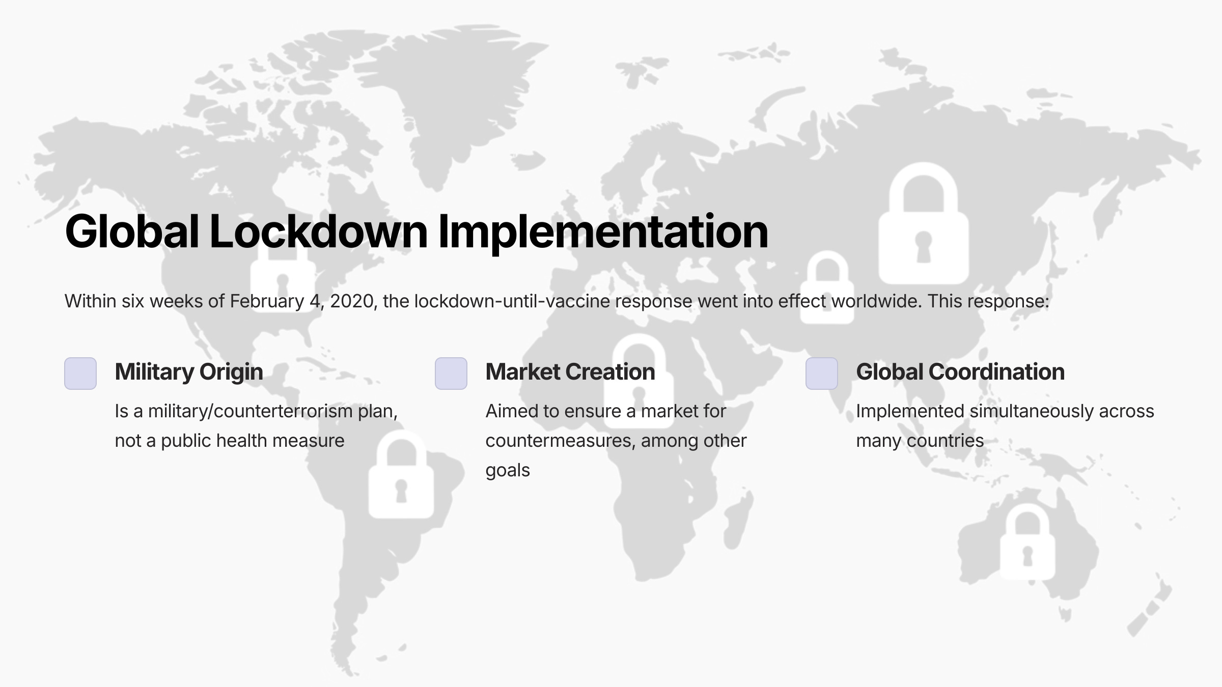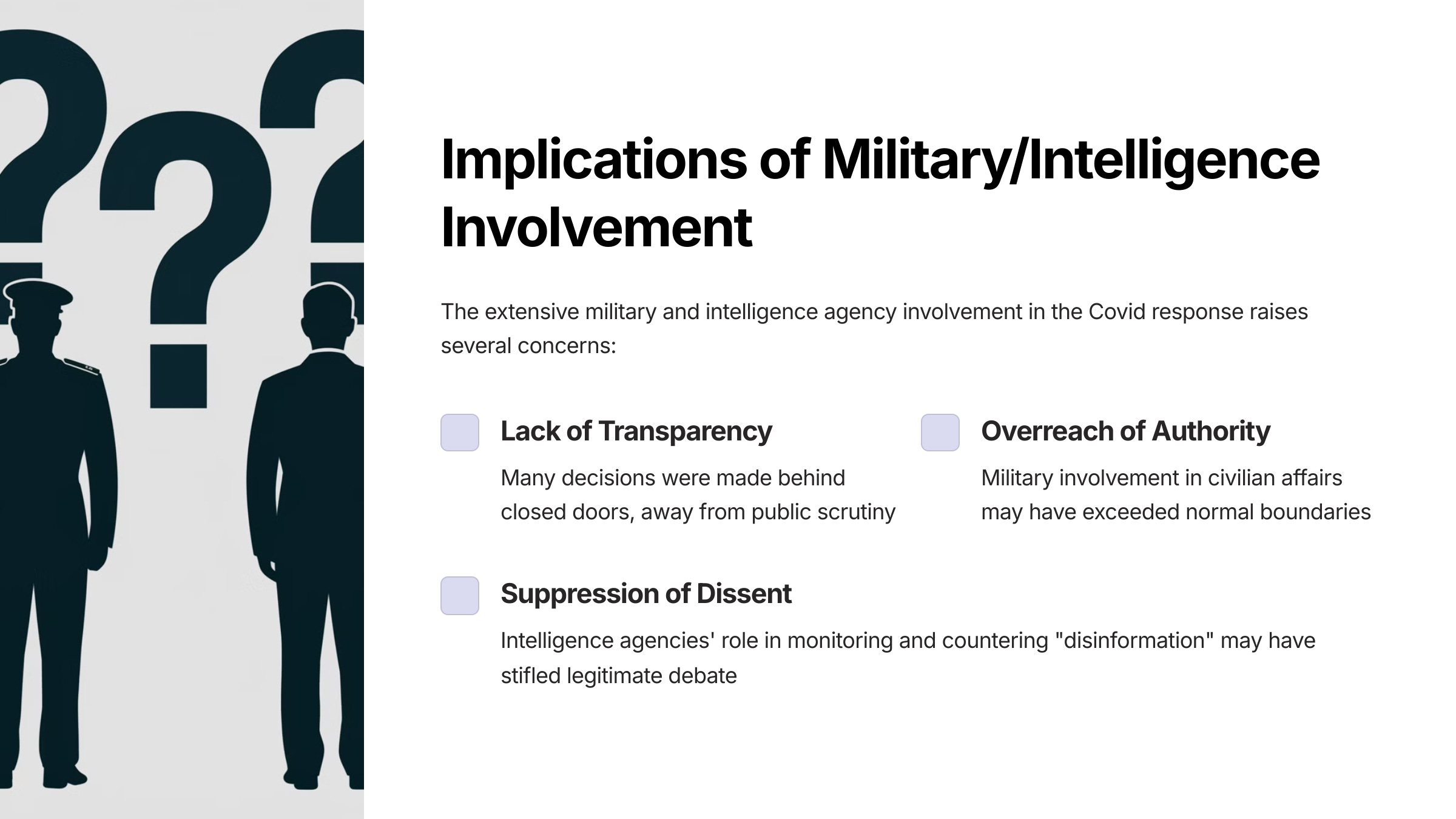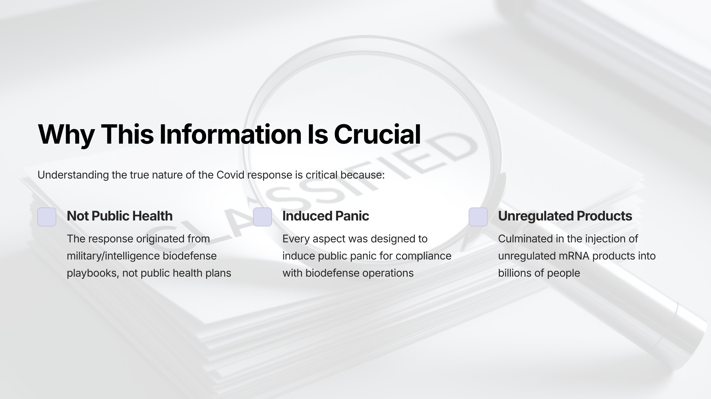 • The measures implemented, including lockdowns, masking, and the deployment of mRNA vaccines, were part of a military biodefense strategy rather than a scientifically based public health plan.