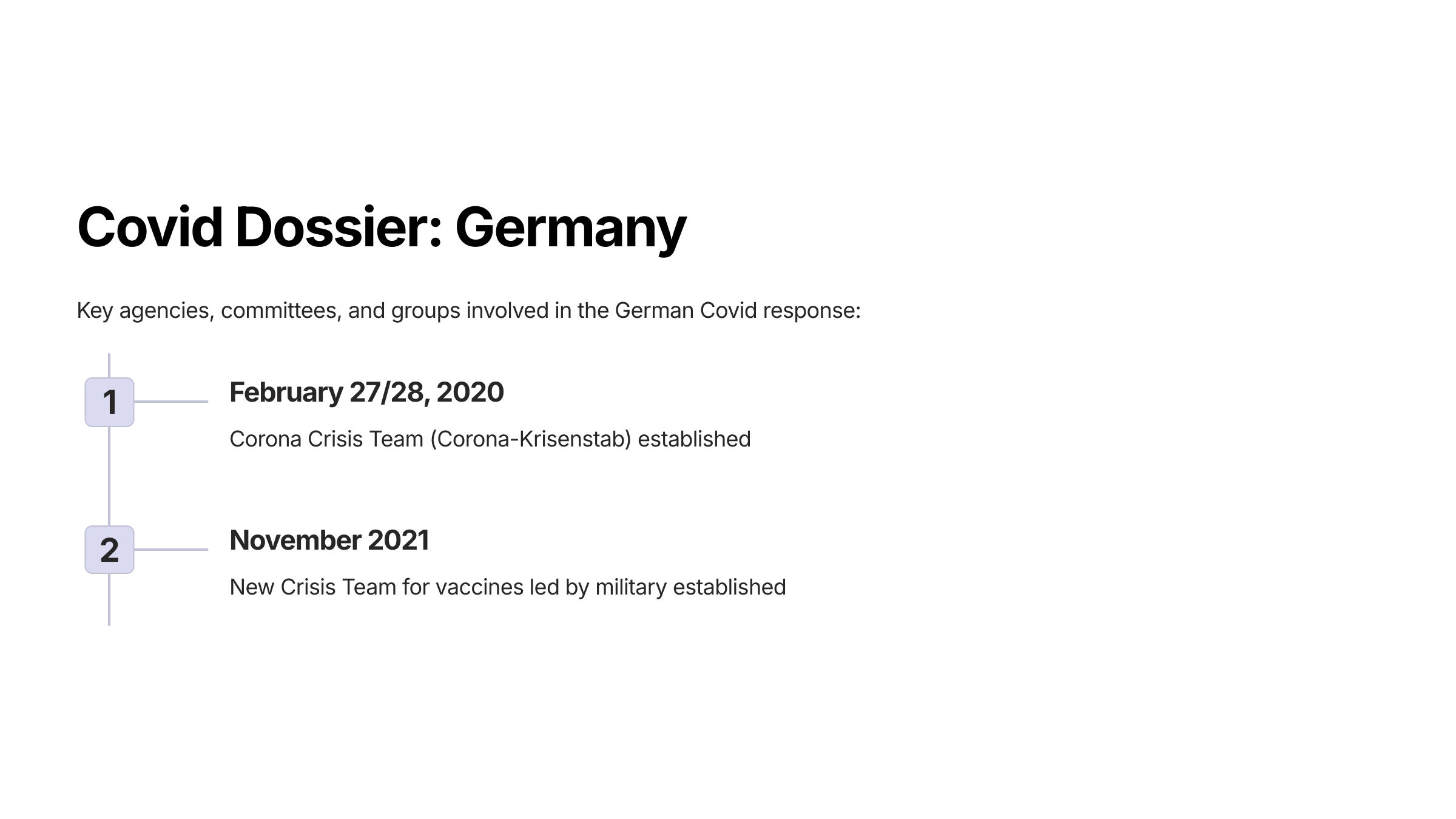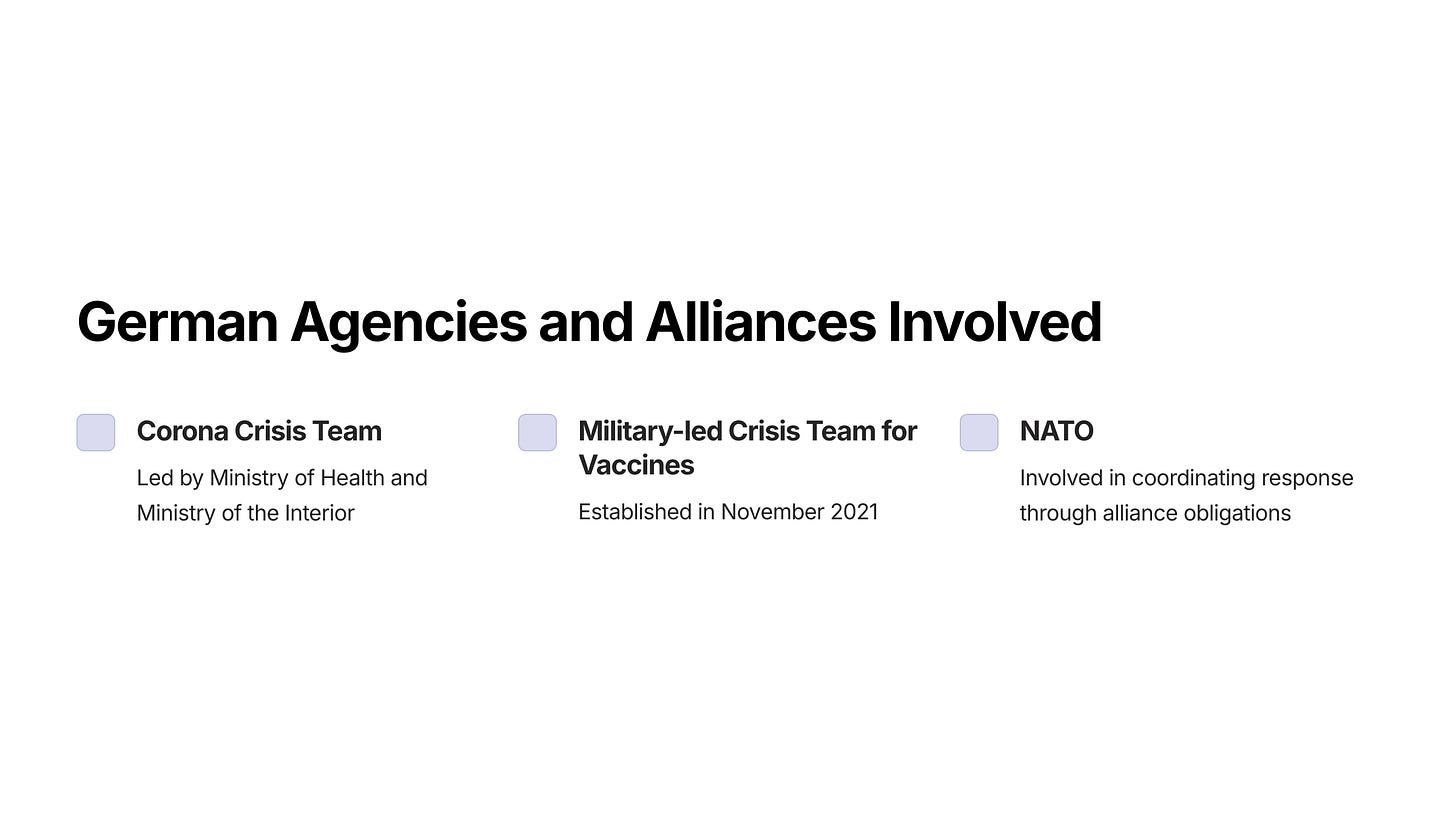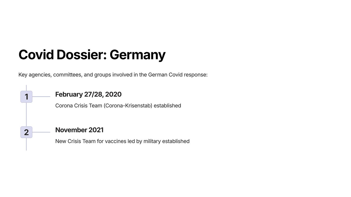 February 27/28: Corona Crisis Team (Corona-Krisenstab) [ref] led by Ministry of Health and Ministry of the Interior (equivalent of DHS + DOJ) [ref]