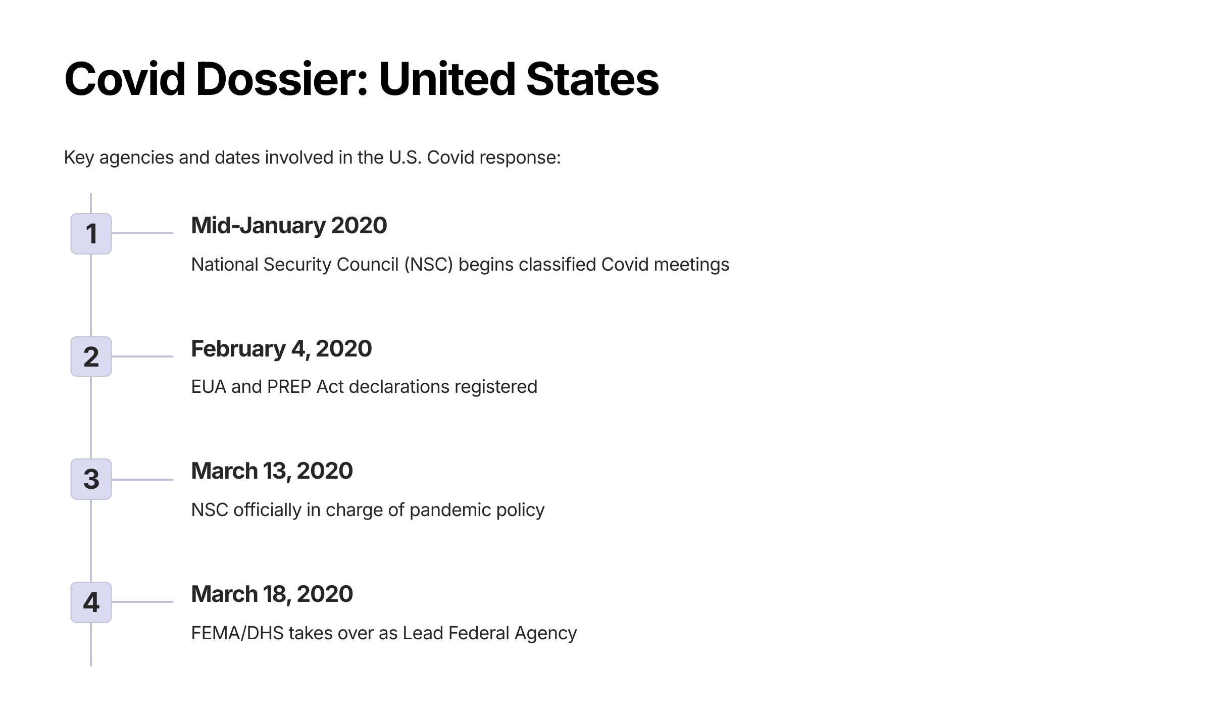 March 13, 2020: NSC officially in charge of pandemic policy in Pandemic Crisis Action Plan-Adapted – the U.S. government’s Covid response plan [ref]