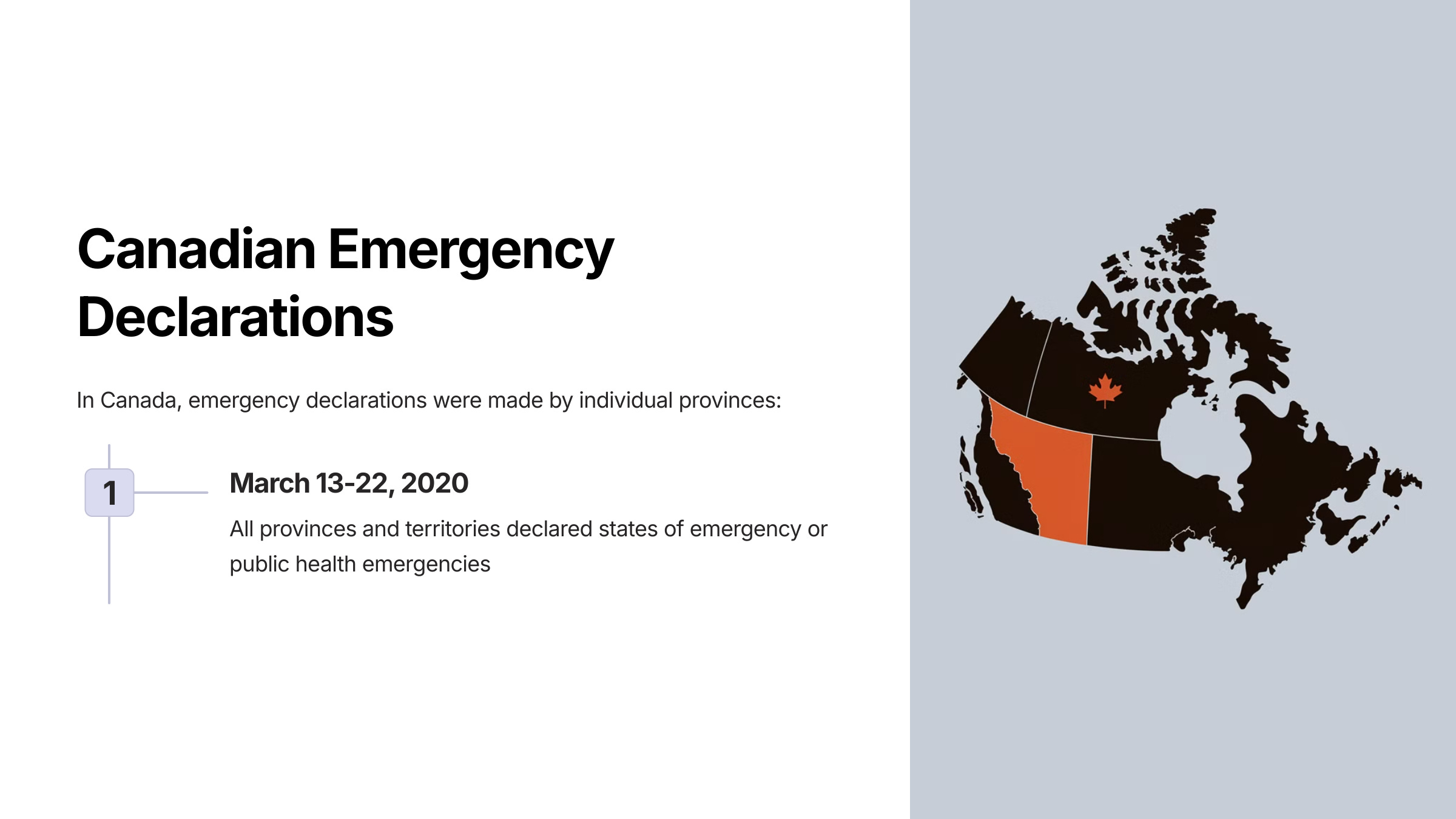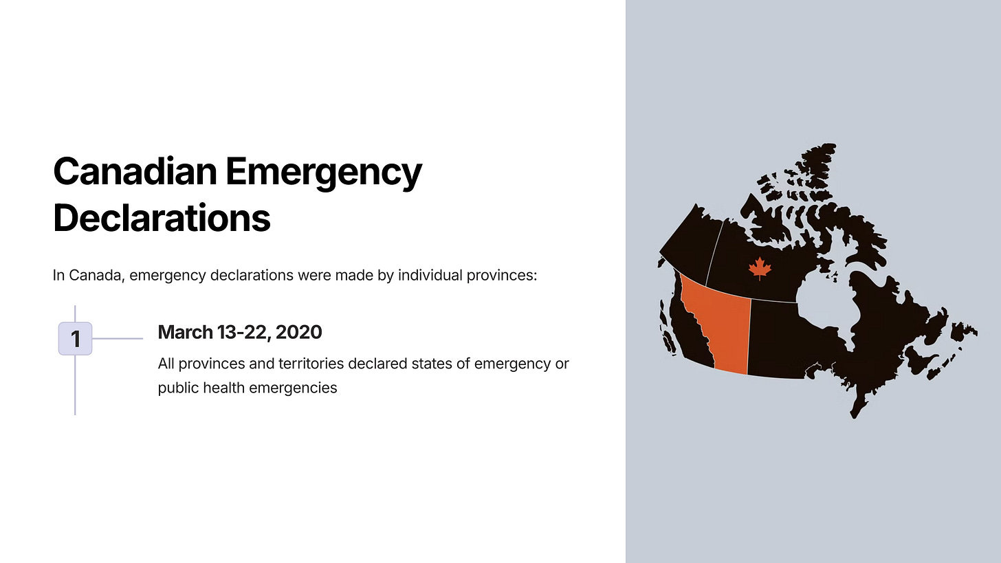 In Canada, the emergency declarations were made by the provinces, as follows [ref]:
