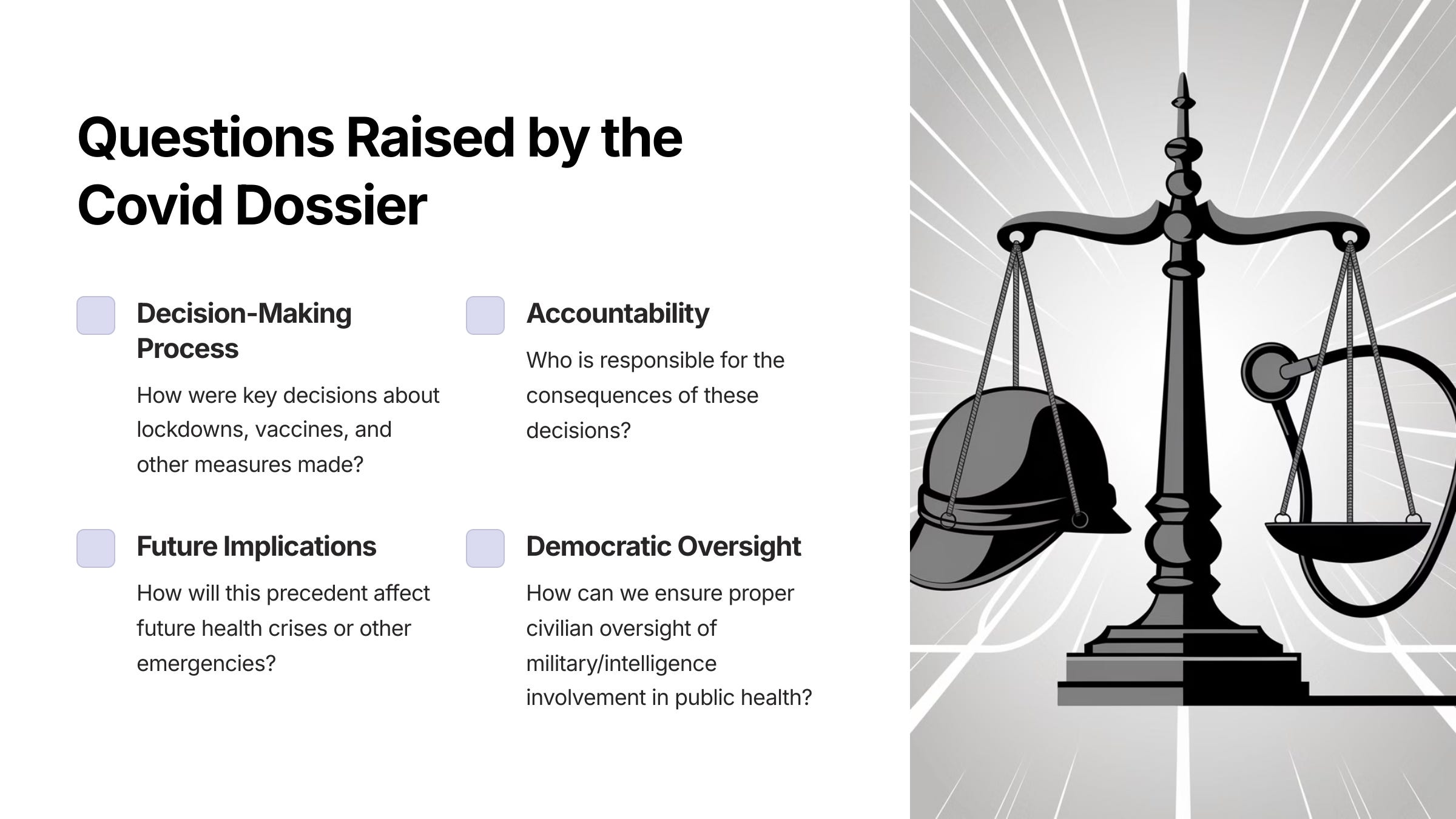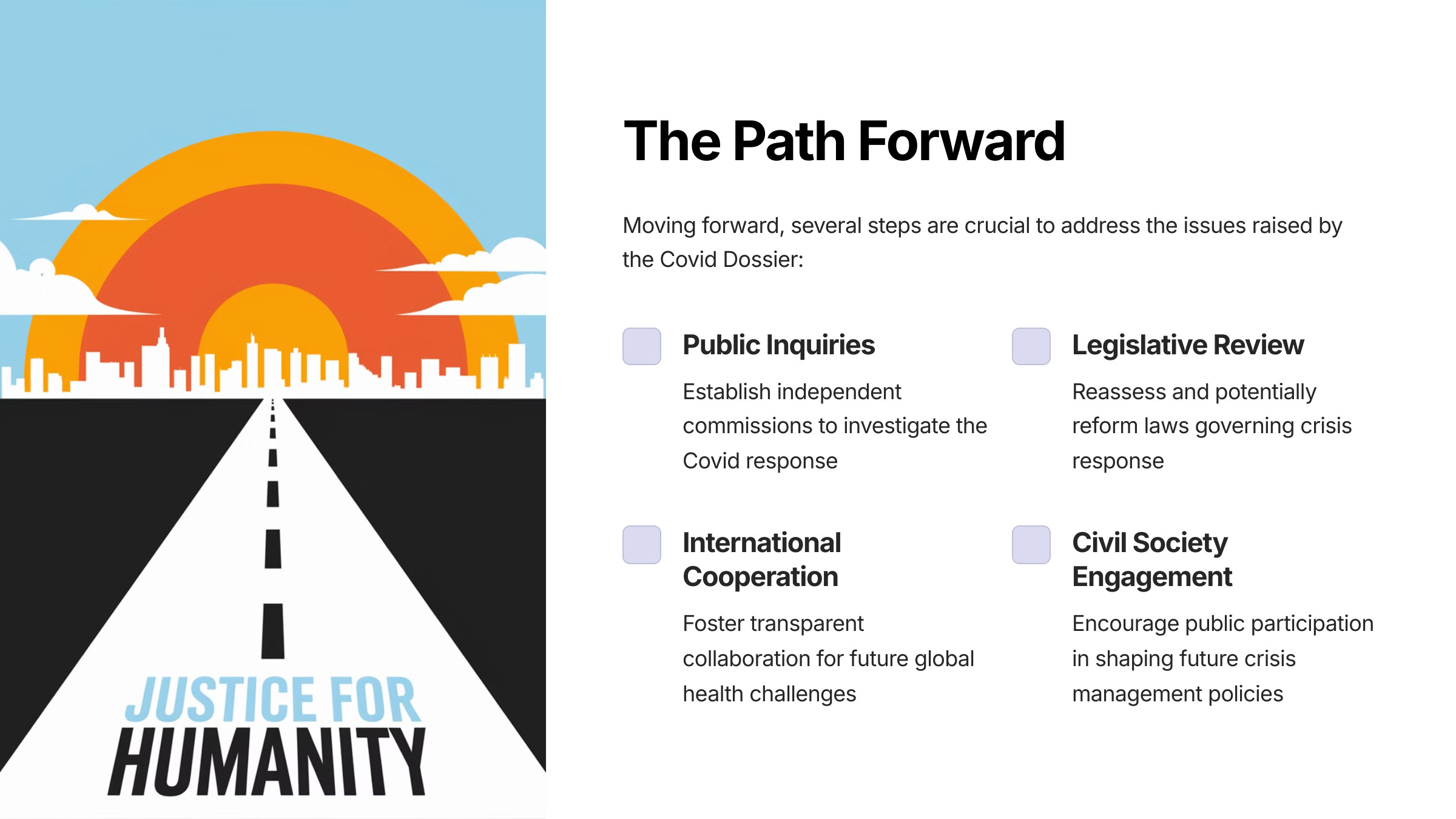 We believe that addressing these issues is critical to restoring public trust and ensuring that future responses to global crises are guided by transparency, accountability, and respect for human rights. We stand ready to provide further information and collaborate with your government to achieve these goals.