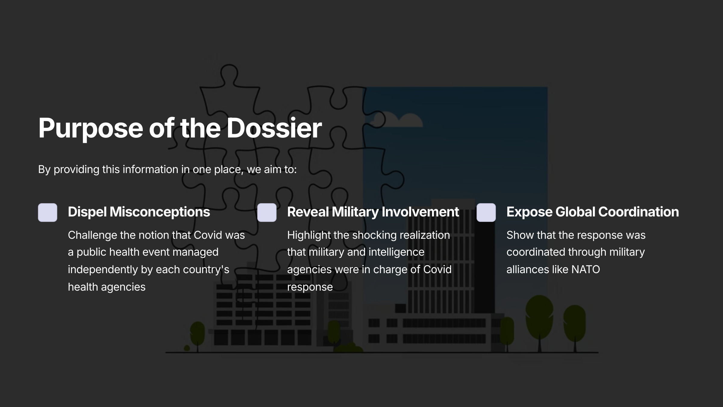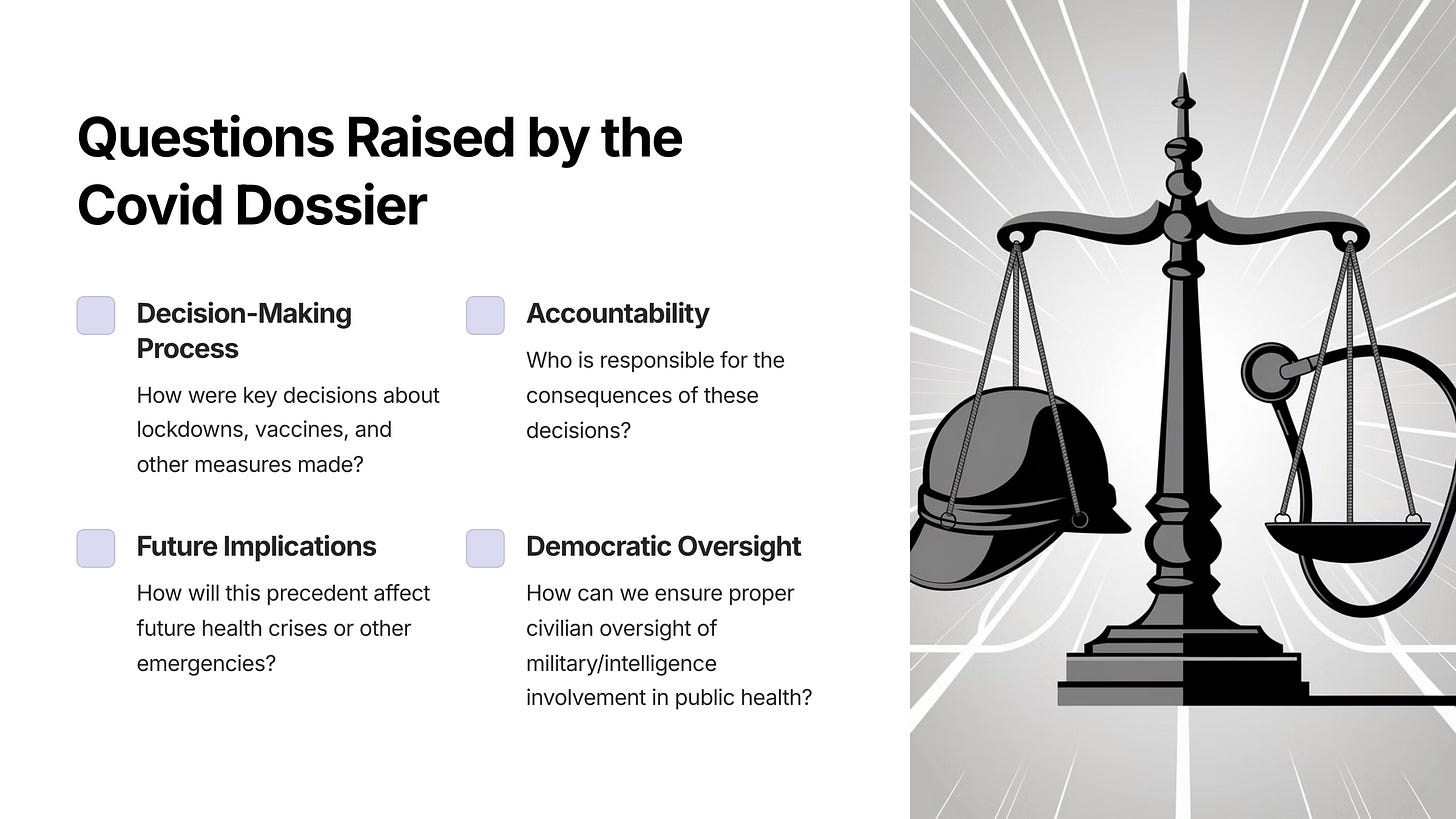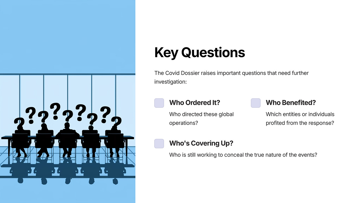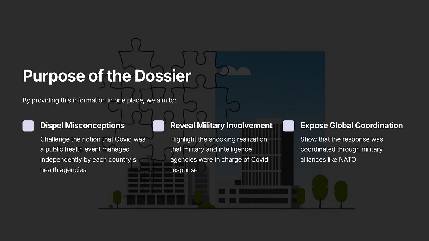 This dossier, compiled by uniquely qualified and independent researchers, reveals that the Covid-19 pandemic was not merely a public health event, but rather a globally coordinated operation involving military and intelligence agencies.