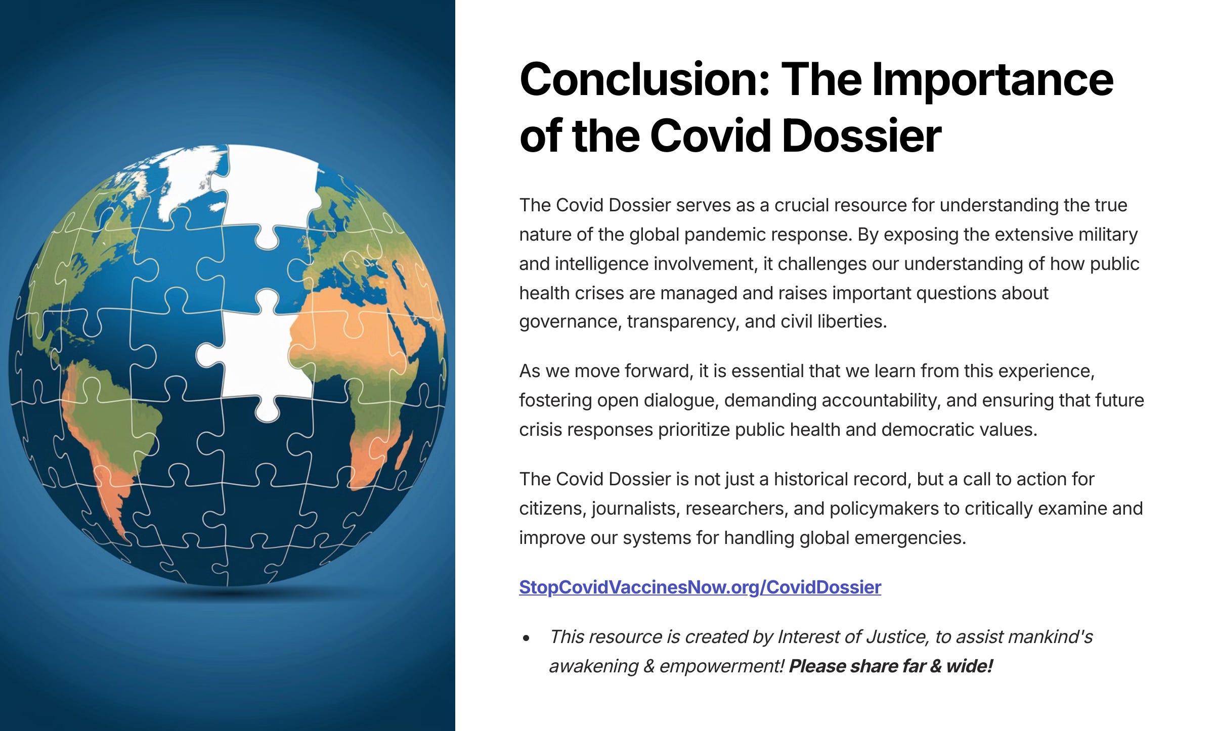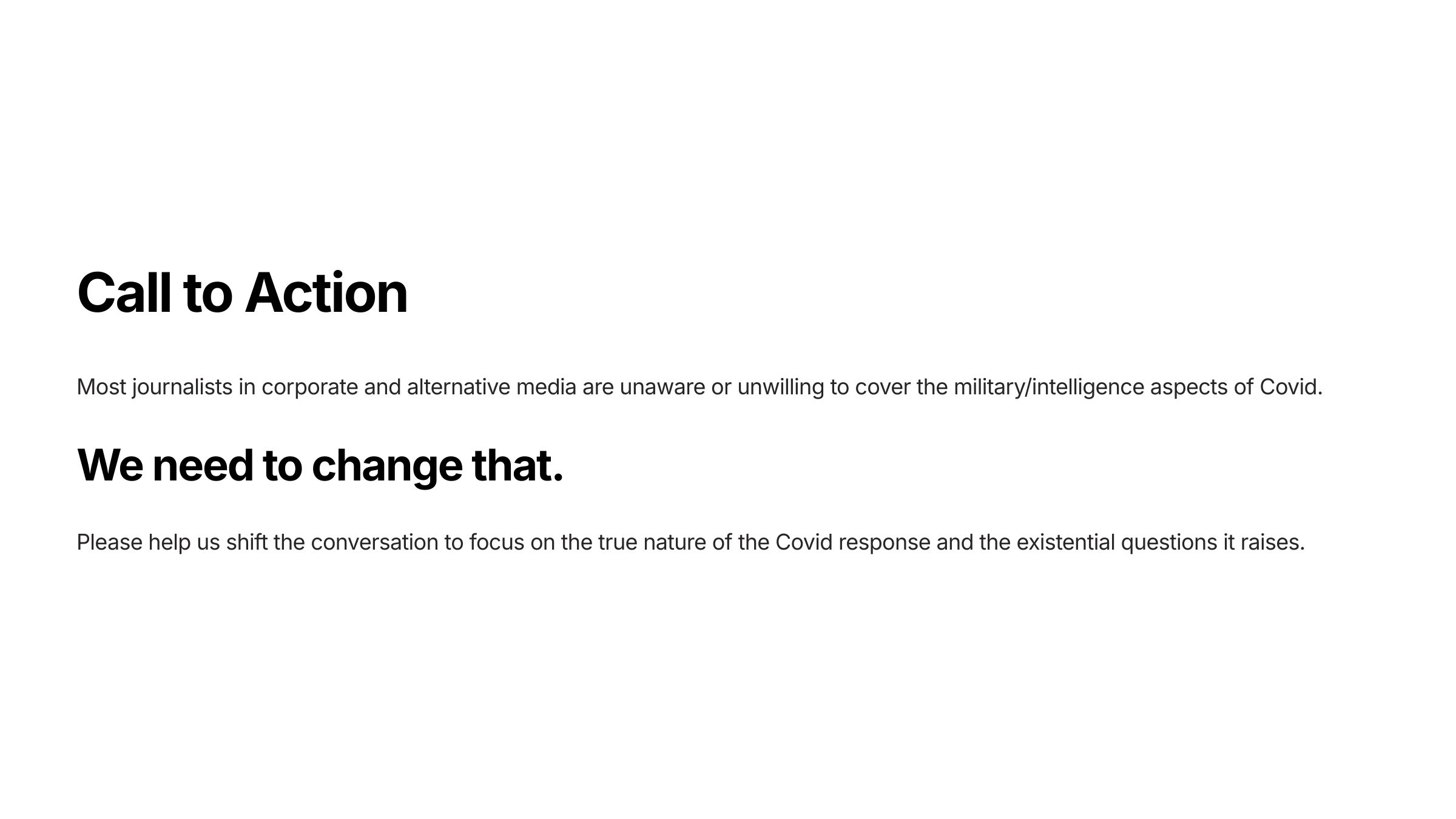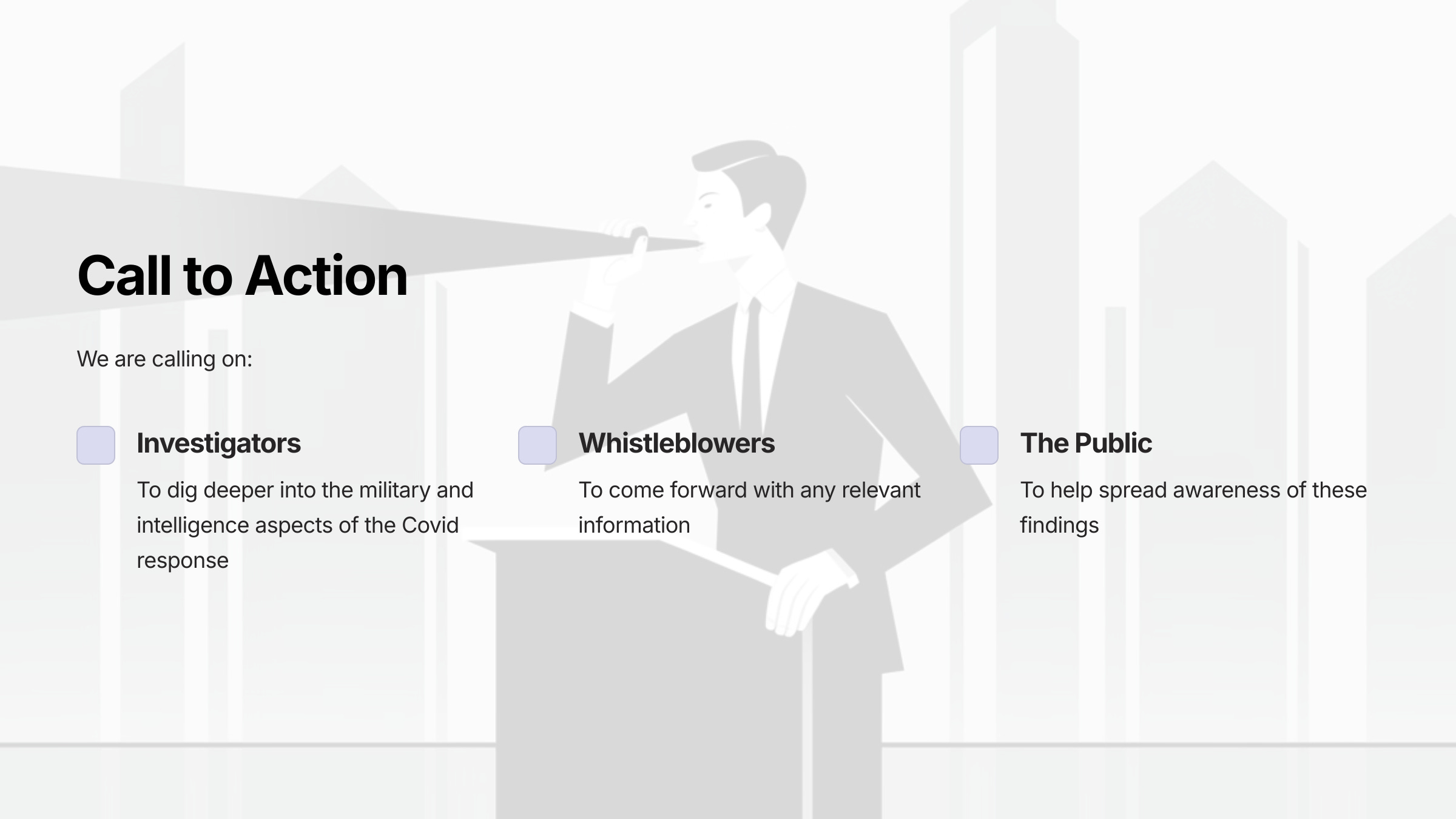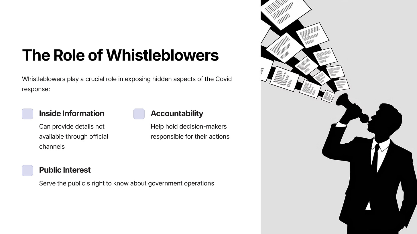 We are calling on investigators, whistleblowers, and anyone with information related to this topic to contact us and/or publish the information so that we can continue to construct the full picture of what happened to the world starting in early 2020 and continuing to this day.