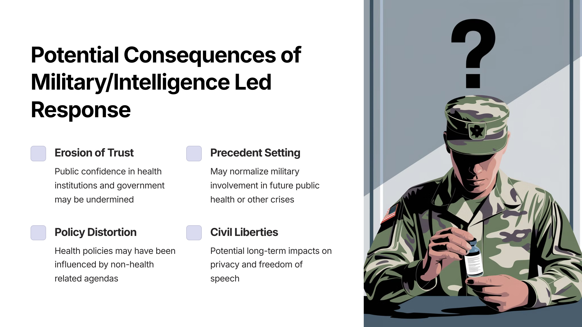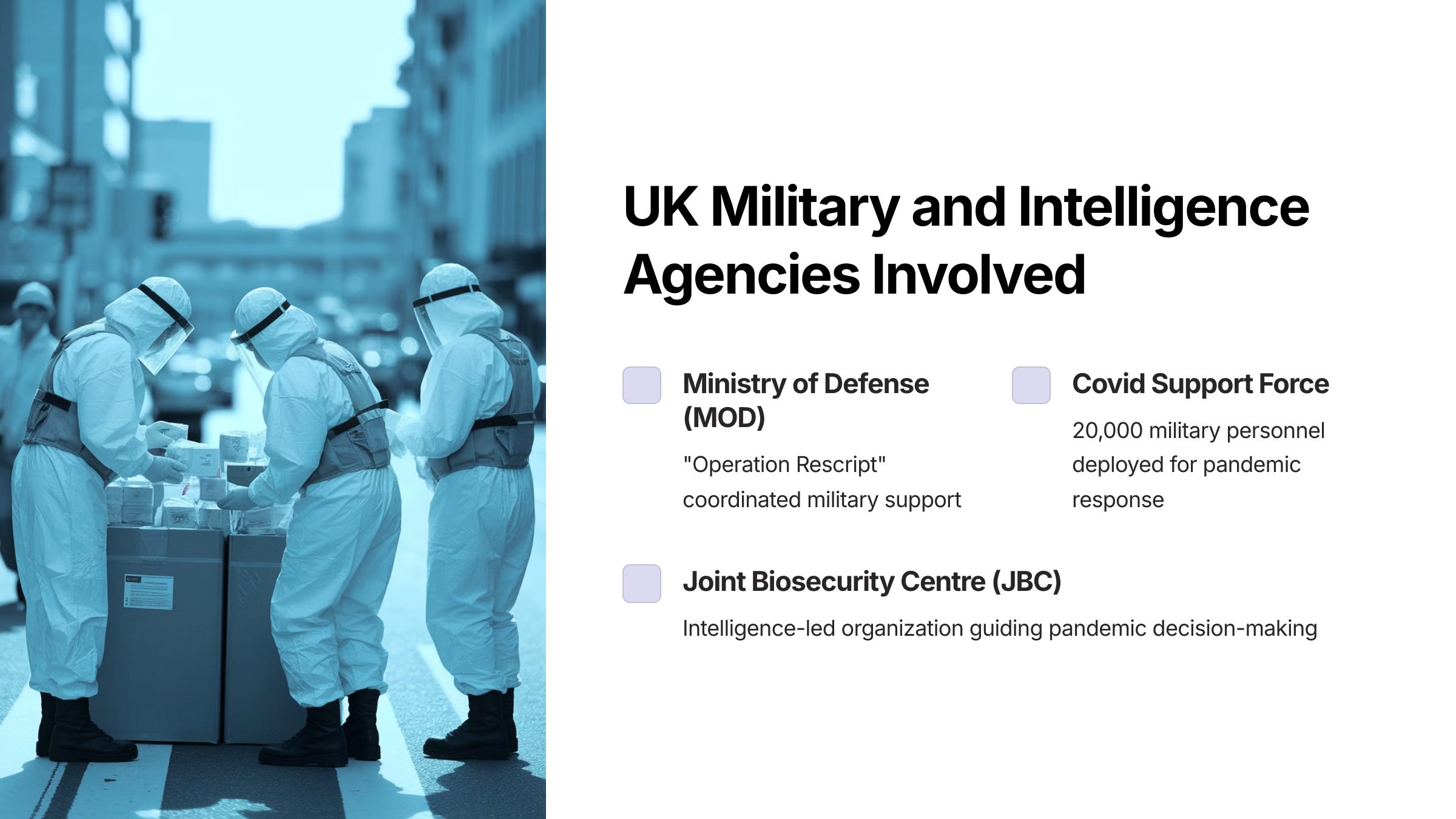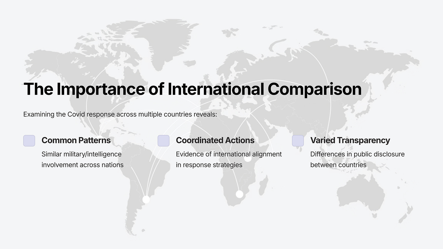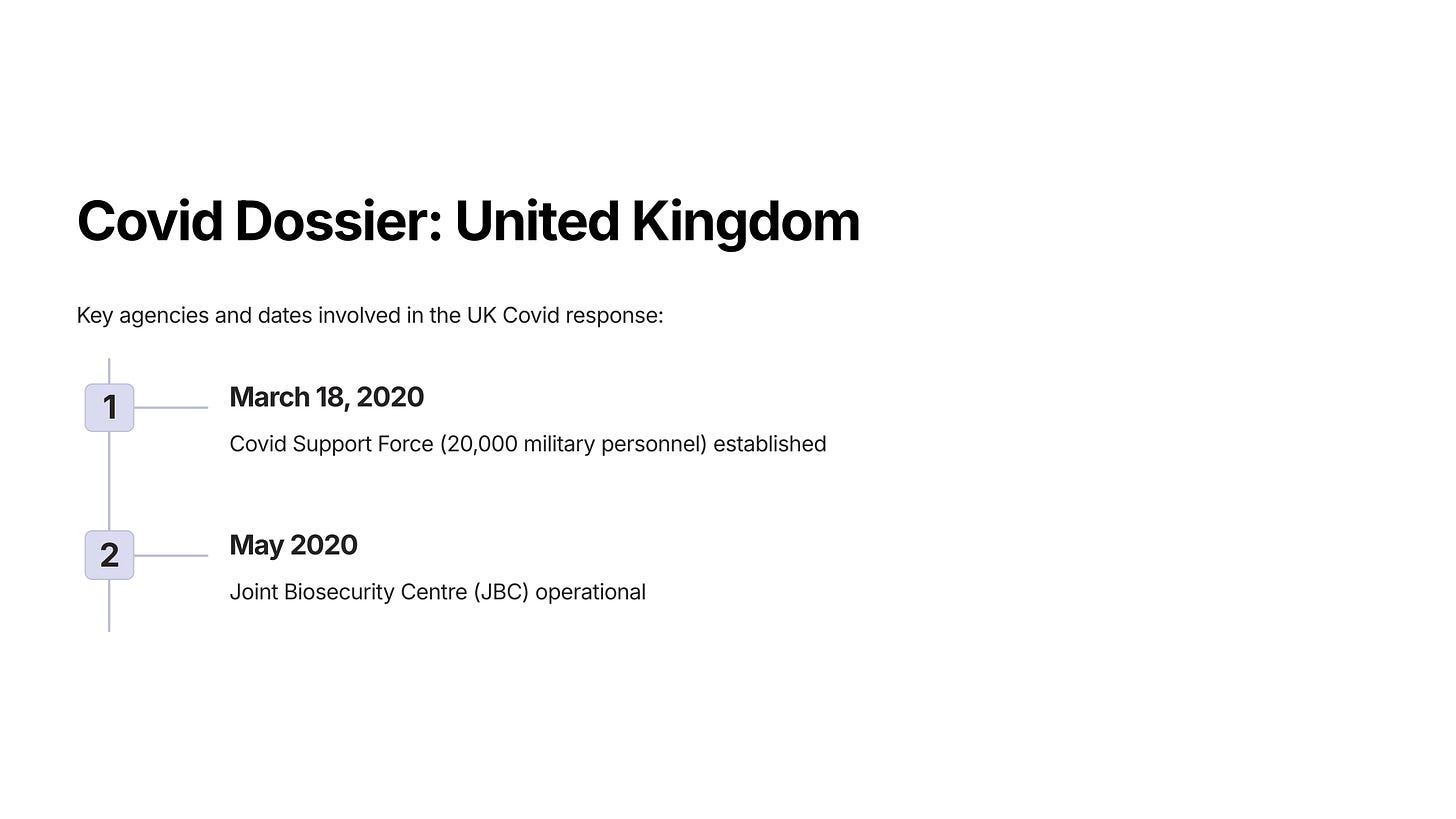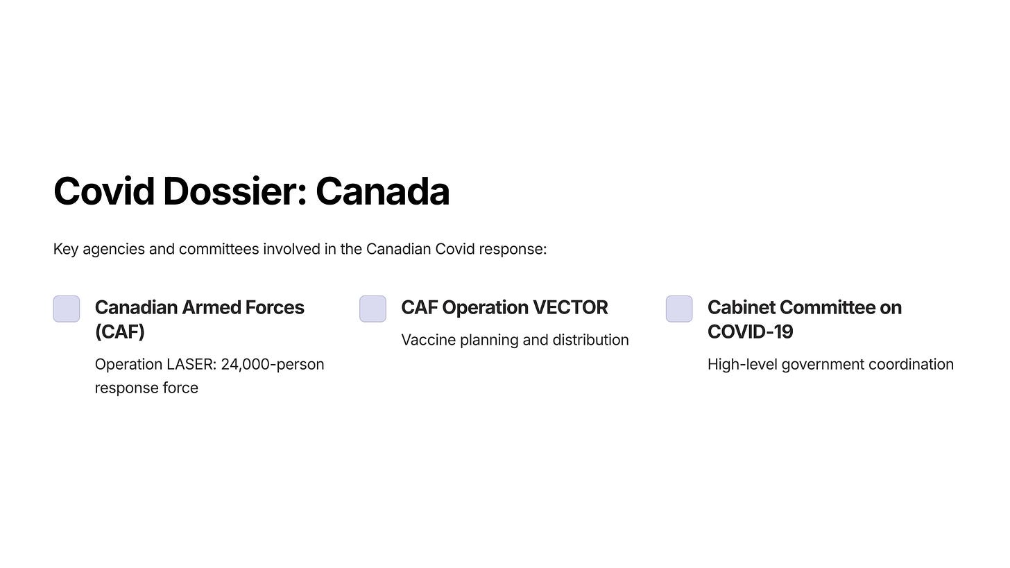 By providing all of this information in one place, we hope to dispel the notion that Covid was a public health event, managed independently by each country’s public health agencies, with some limited, logistically focused military involvement.