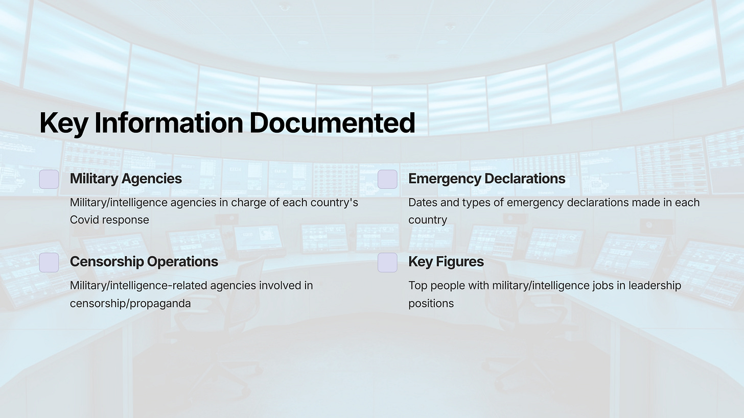 For as many countries as possible, we list the military/intelligence agencies in charge of their country’s Covid response; dates on which emergency declarations were made in each country; military/intelligence-related agencies and bodies in charge of censorship/propaganda; and top people with military/intelligence jobs who were known or reported to hold leadership positions in the response.