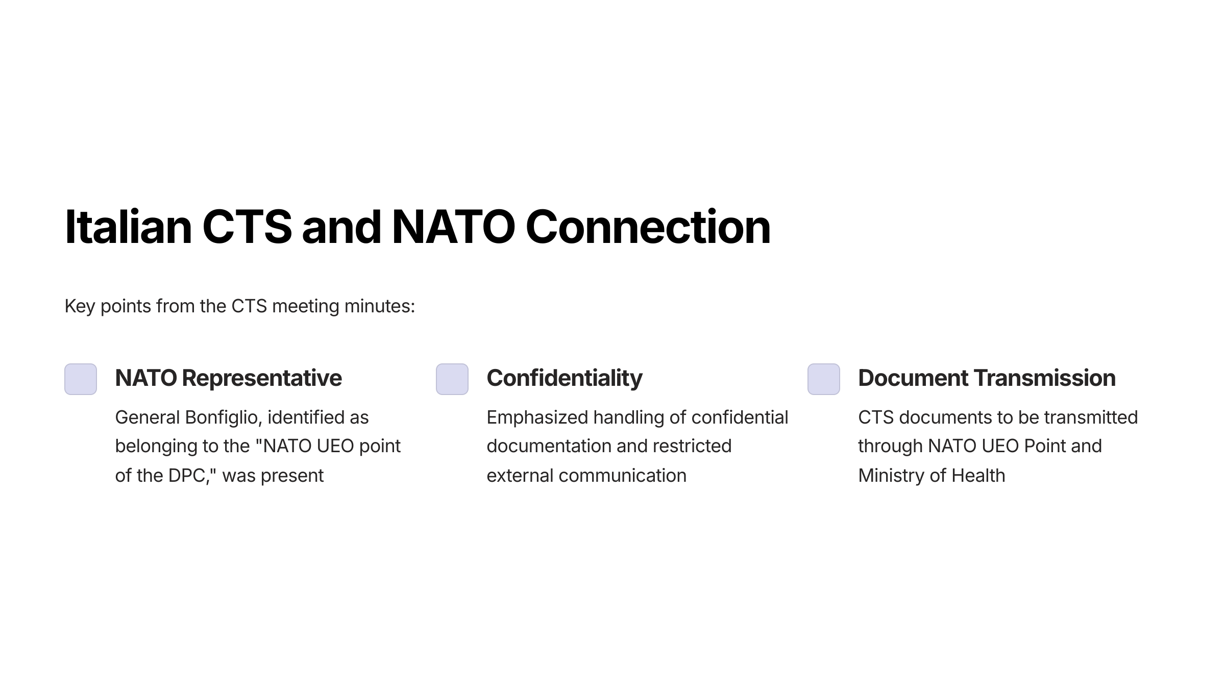 Minutes of a CTS meeting held on March 5, 2020, obtained through FOIA [ref], include statements by General Bonfiglio [for whom no biographical or background information is available on the Internet, as far as we can tell], identified as belonging to the “NATO UEO point of the DPC.” [ref]
