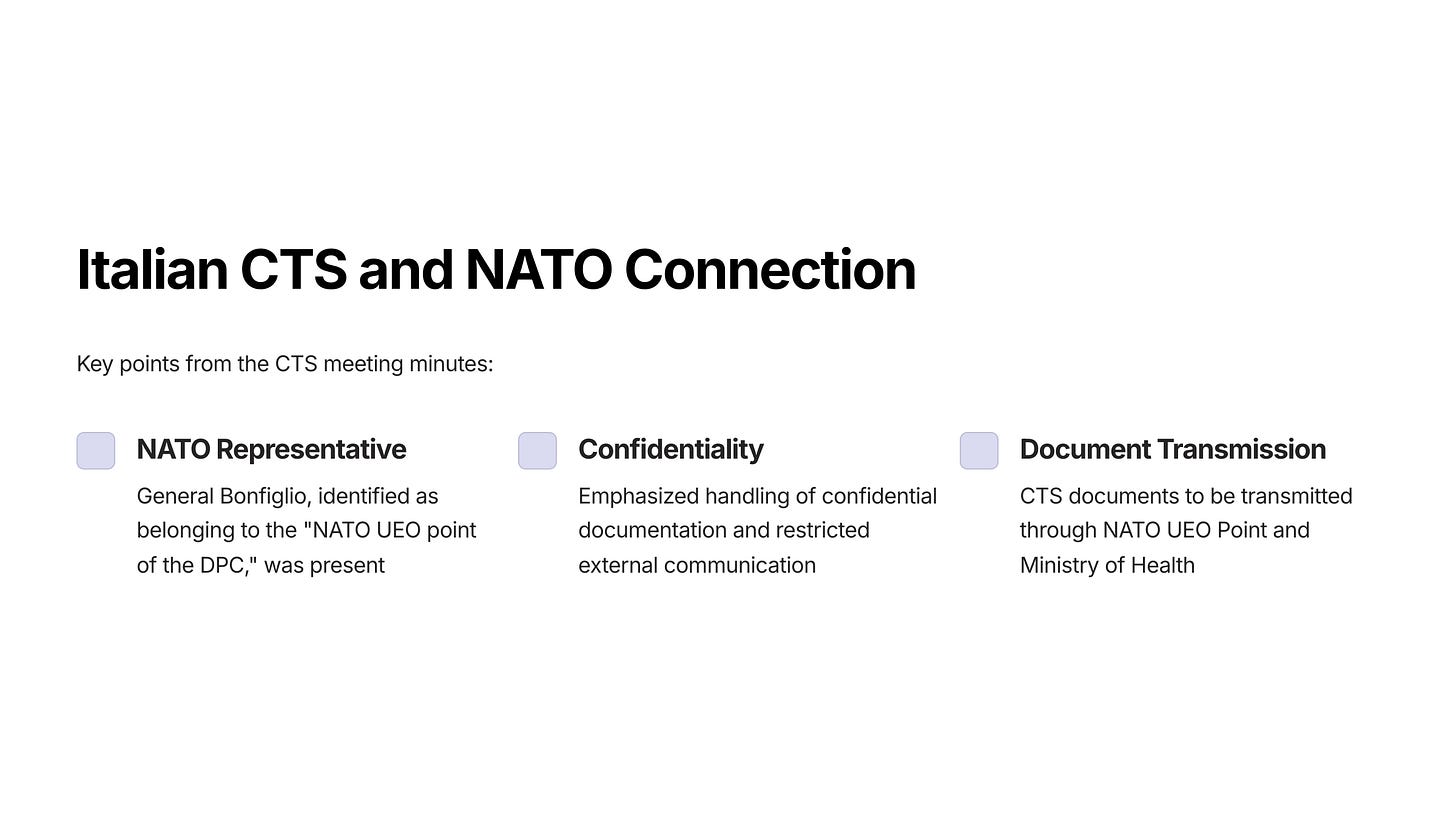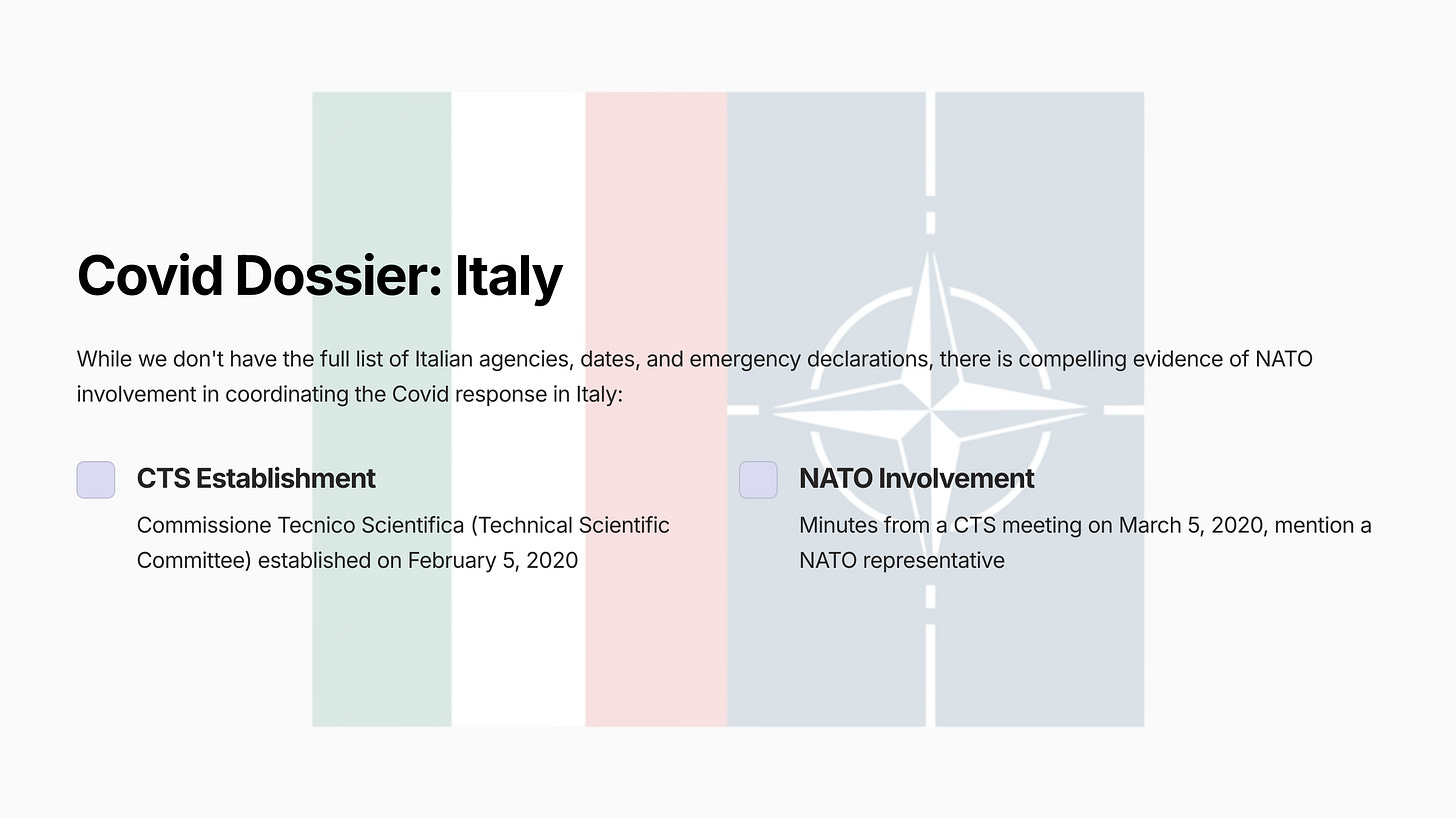 Although we do not yet have the full list of Italian agencies, dates, emergency declarations etc., we do have compelling evidence that NATO was involved in coordinating the Covid response in Italy: