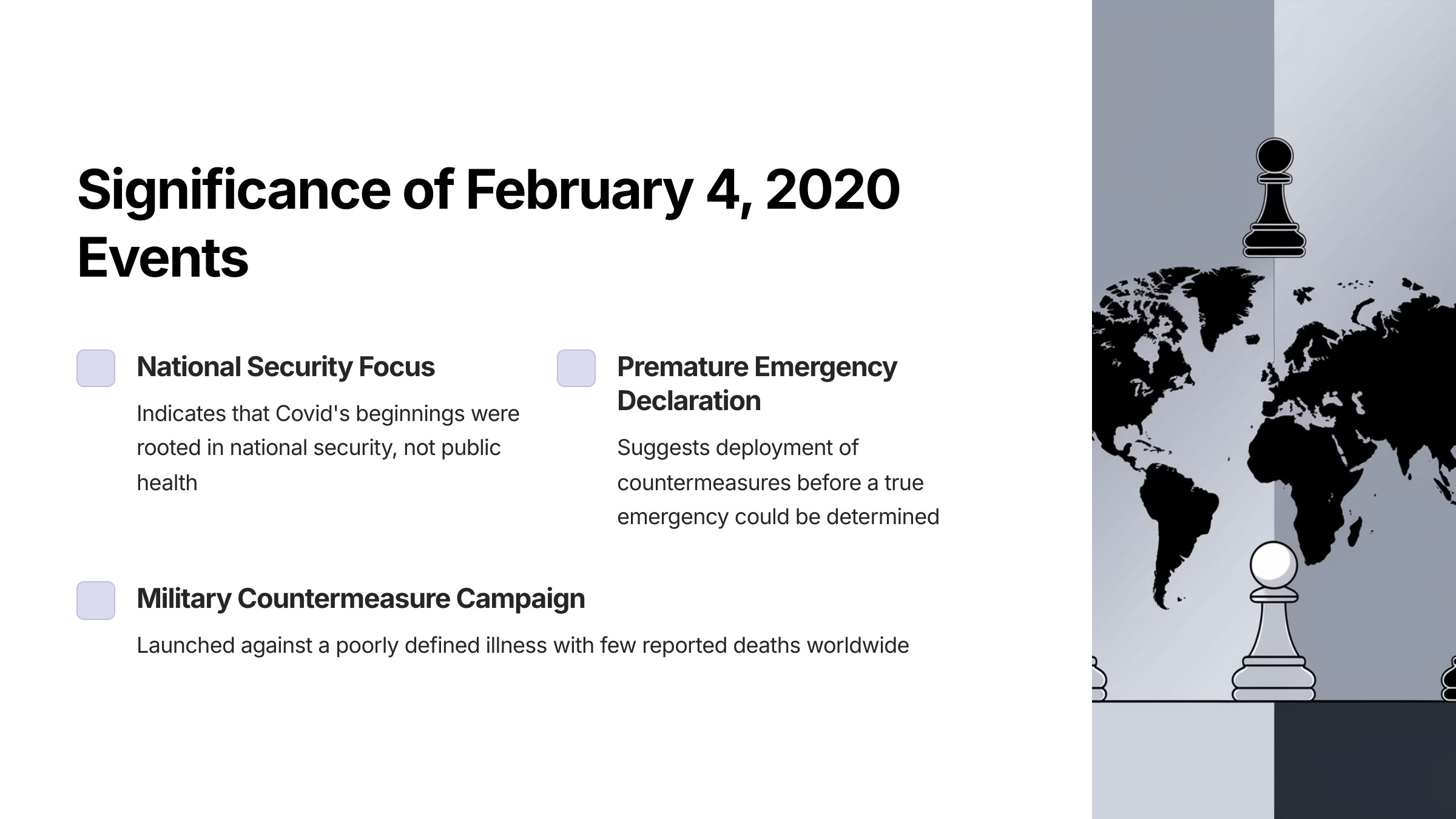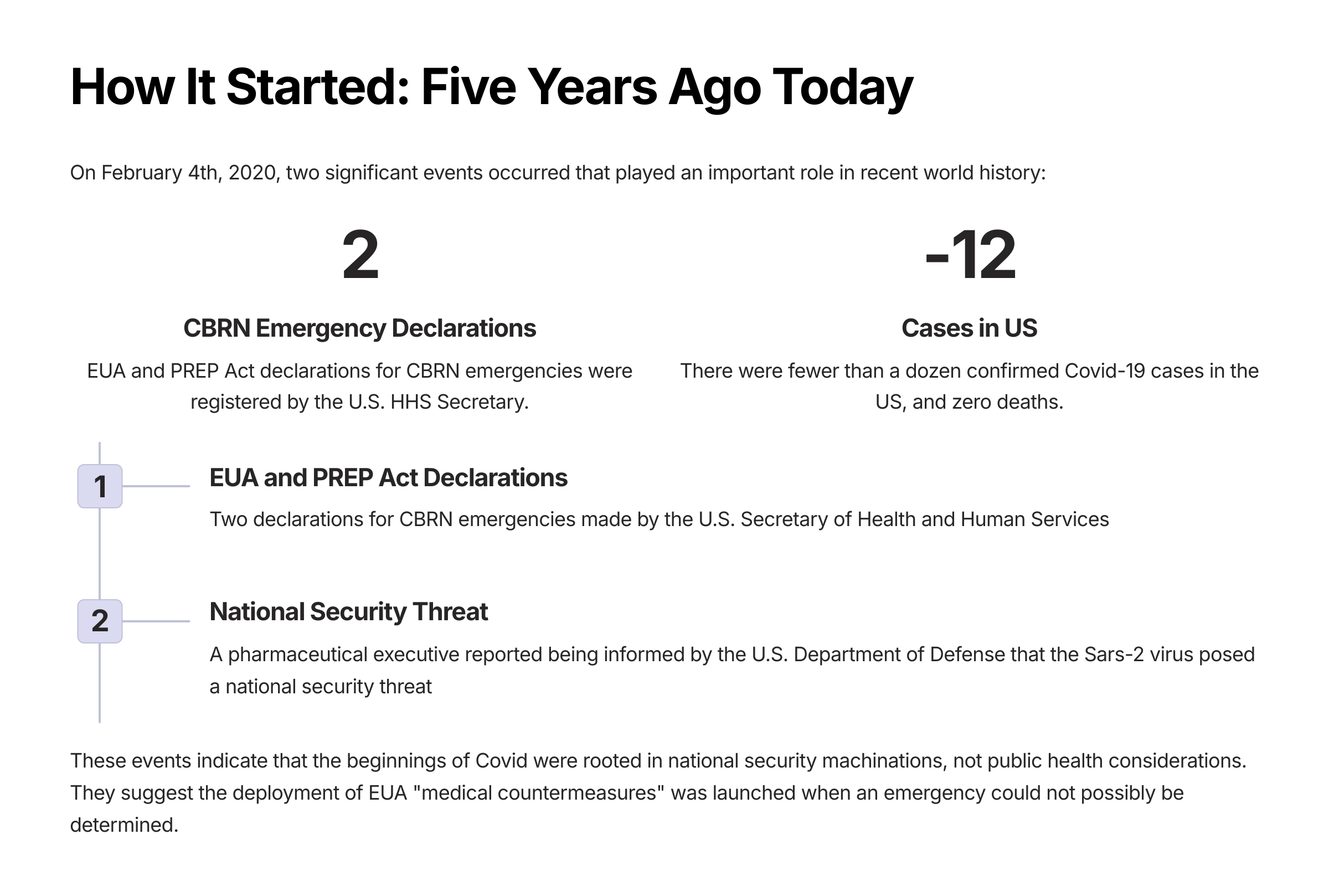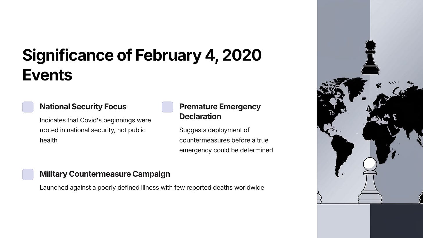 It is important to note that on February 4, 2020, there were fewer than a dozen confirmed cases of the novel coronavirus disease (later called Covid-19) in the US, and zero deaths. Worldwide, the death count was fewer than 500. There was nothing about the virus, at least as it was presented publicly, that would make anyone believe it posed a threat to national security.