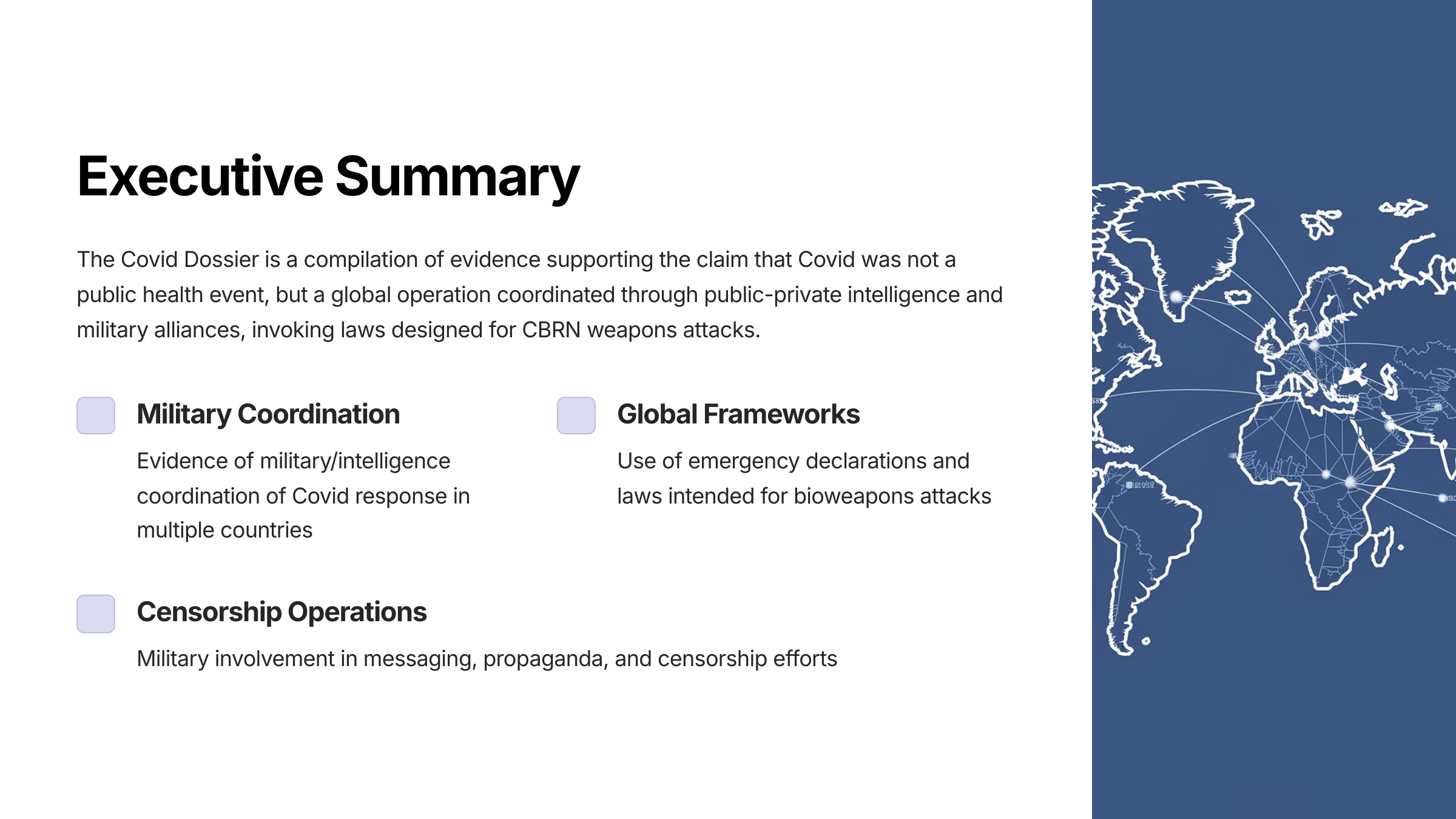 The Covid Dossier is a compilation of the evidence we have amassed over the last three years supporting the following claim: Covid was not a public health event, although it was presented as such to the world’s population. It was a global operation, coordinated through public-private intelligence and military alliances and invoking laws designed for CBRN (chemical, biological, radiological, nuclear) weapons attacks.
