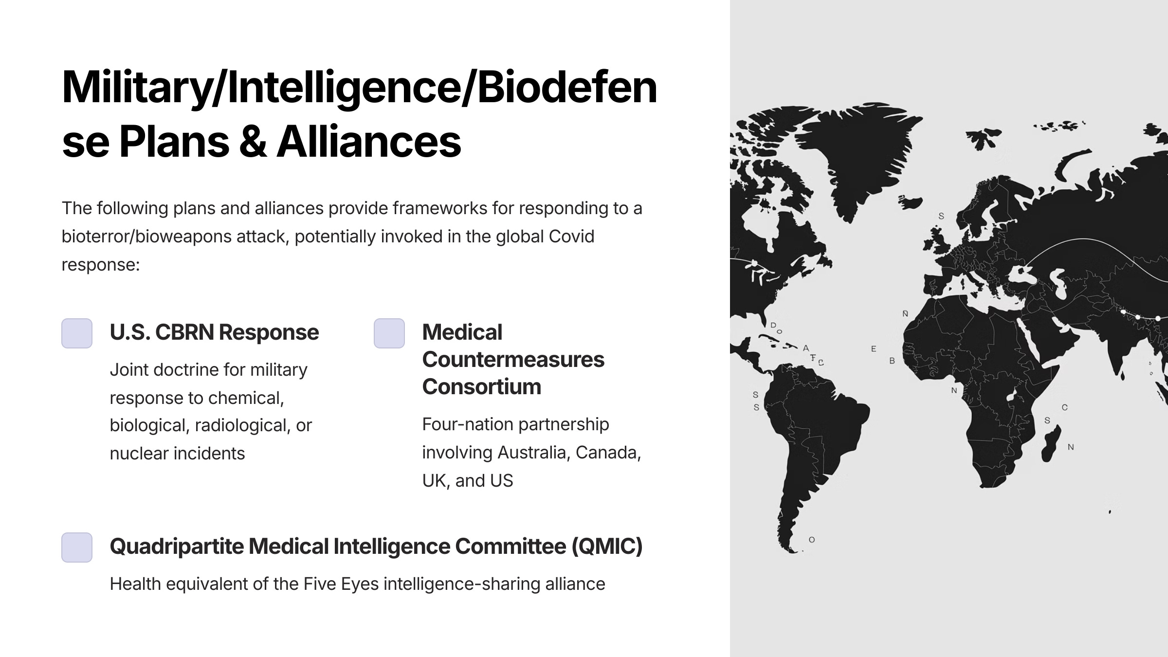 We also list connections to global governing bodies, including the EU and UN/WHO, through which the response was coordinated. In the final section, we provide a list of military/intelligence/biodefense alliances and agreements that provide multinational frameworks for responding to a bioterror/bioweapons attack.