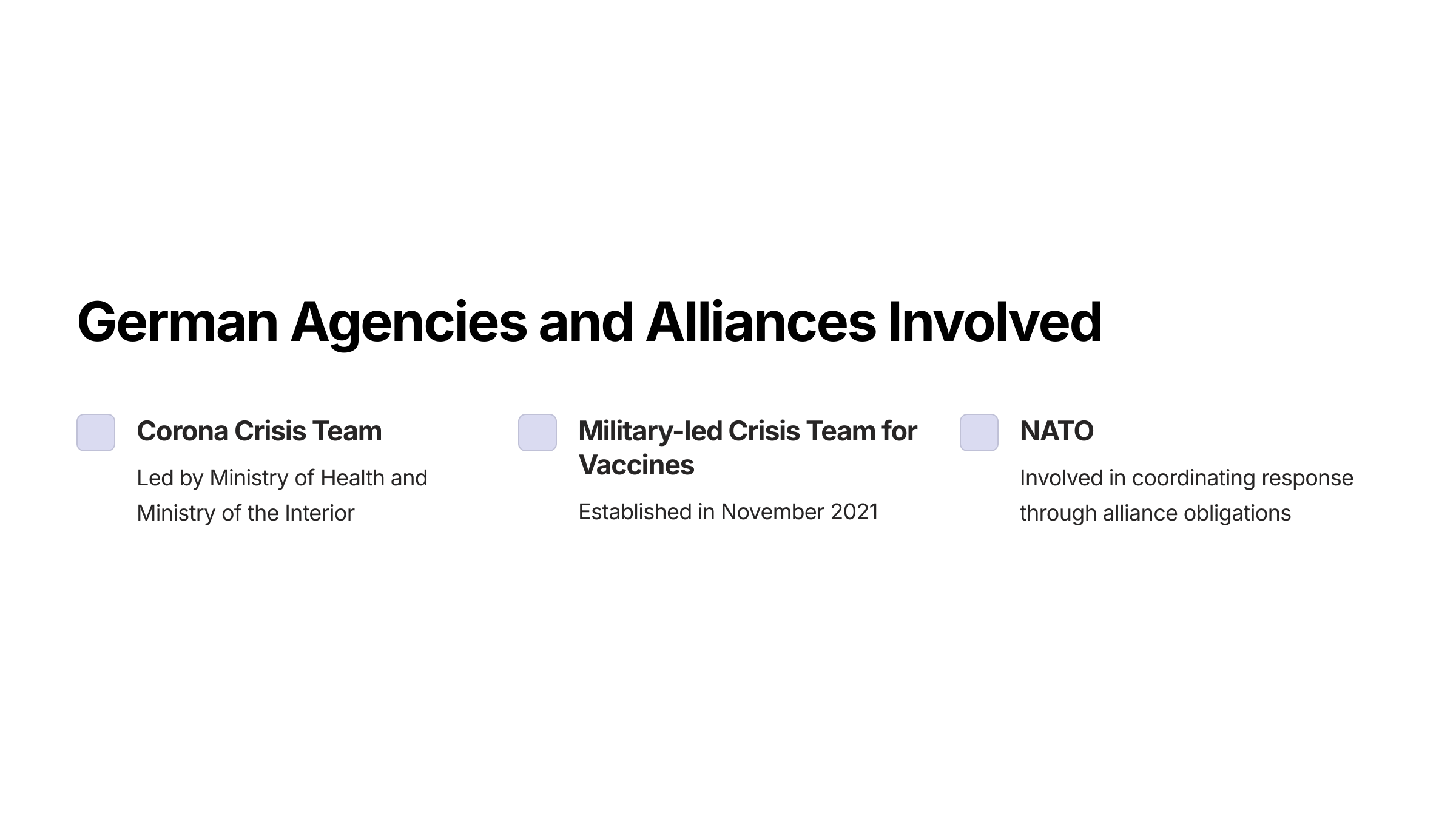 • The response was coordinated through military alliances such as NATO and involved global governing bodies like the EU and the UN/WHO.
