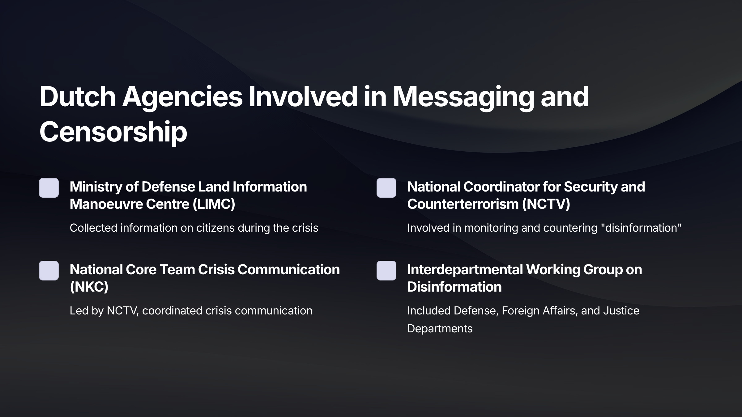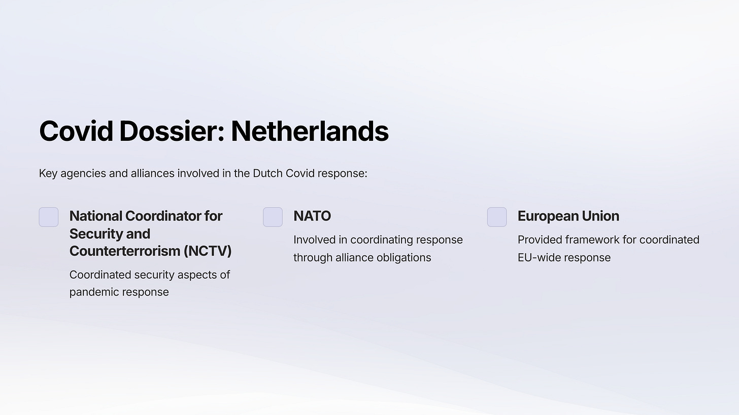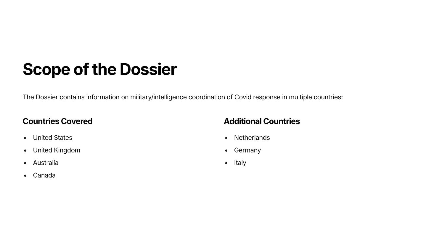 The Dossier contains information regarding the military/intelligence coordination of the Covid biodefense response in the U.S., U.K., Australia, Canada, the Netherlands, Germany, and Italy. For some countries we have extensively documented information. For others, we have some documentation of military/intelligence involvement, but not all the details.