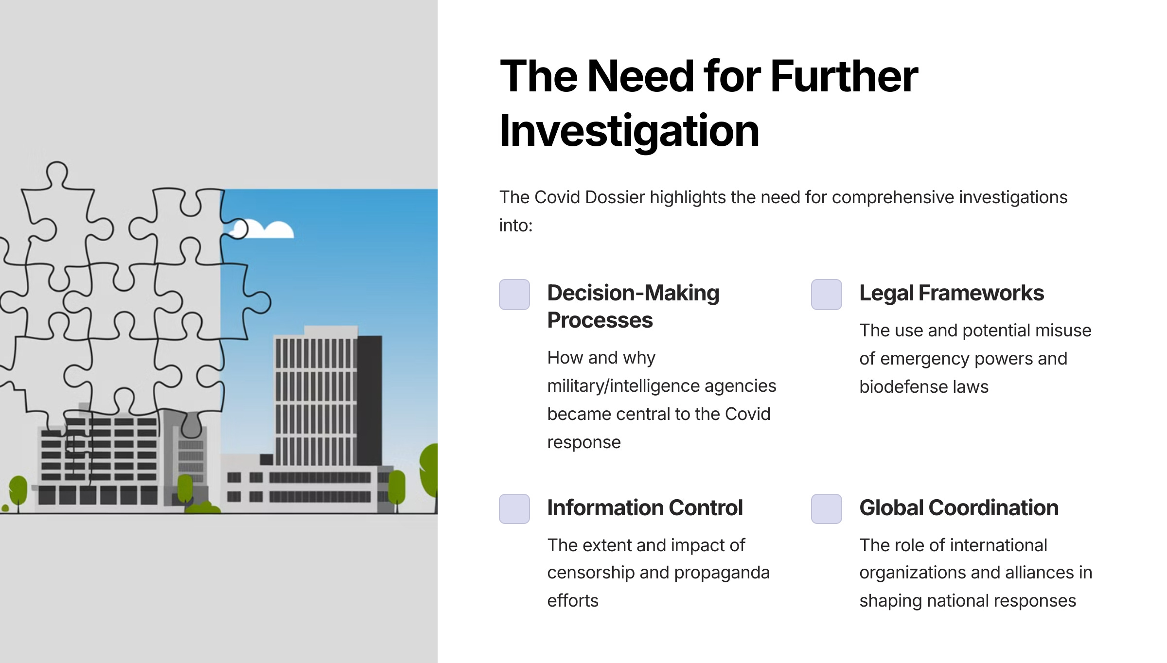 We, the undersigned, are writing to bring to your attention the findings compiled in the Covid Dossier, a comprehensive document that sheds light on the global coordination of the Covid-19 response.