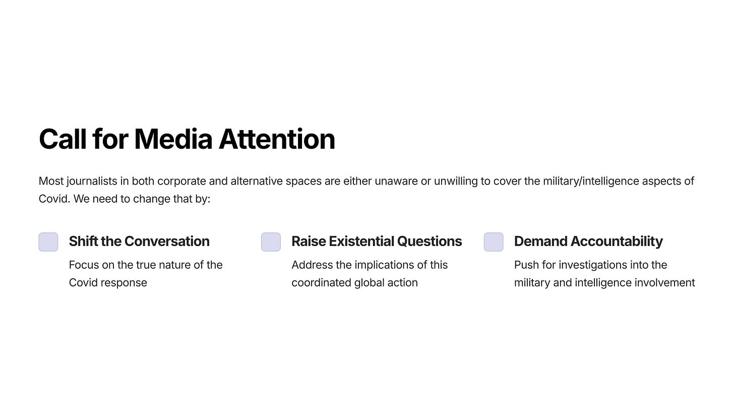 Most journalists in both corporate and alternative spaces are either unaware or unwilling to cover the military / intelligence / biodefense / global coordination aspects of Covid.