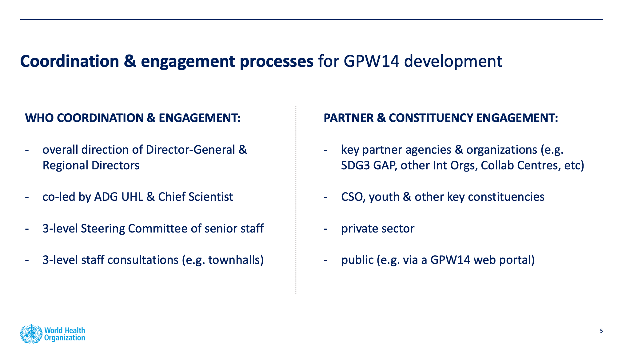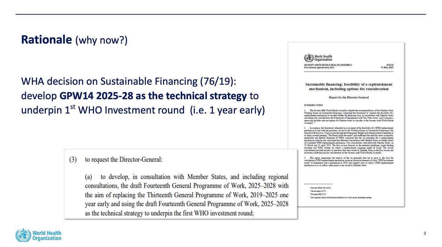 Please save the date on 12 January 2024 at 13:30-15:00 CET for a virtual consultation on the version of the WHO General Programme of Work (GPW14) which is to be presented to the WHO Executive Board at its 154th session during 22-27 January 2024.